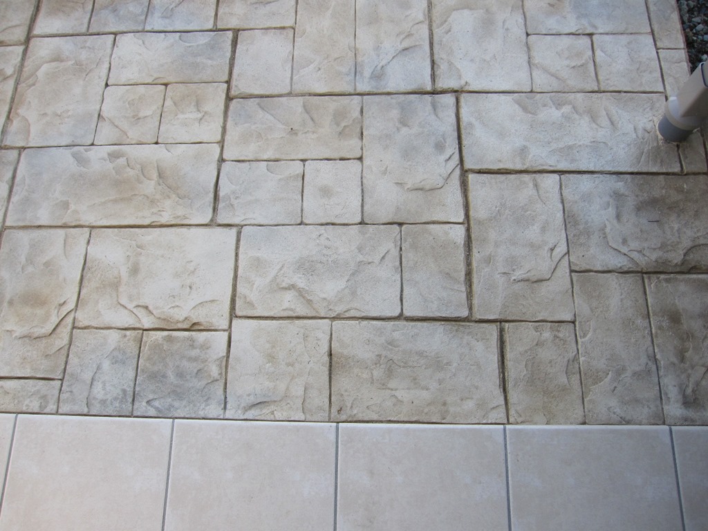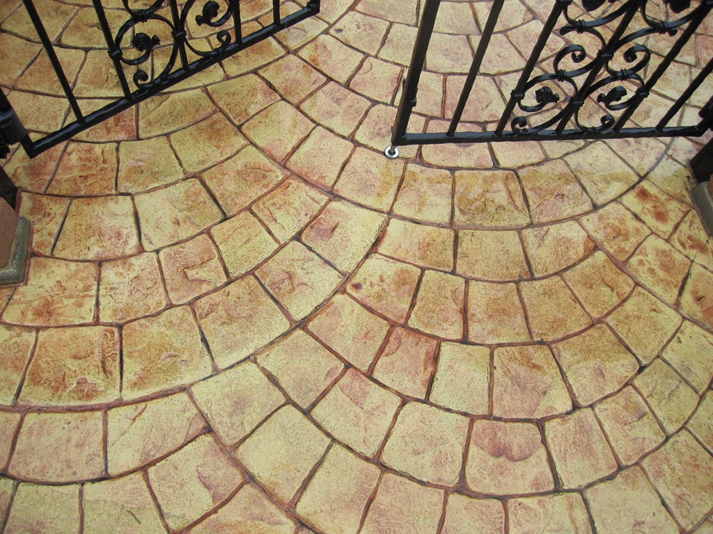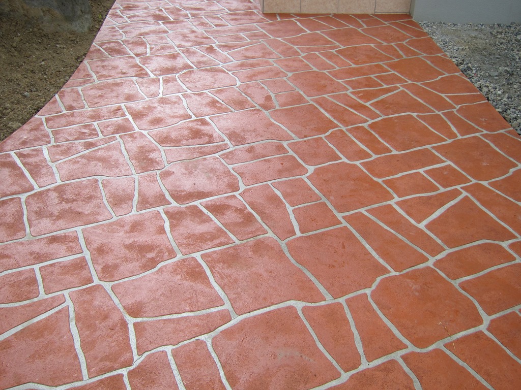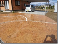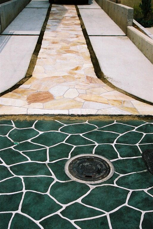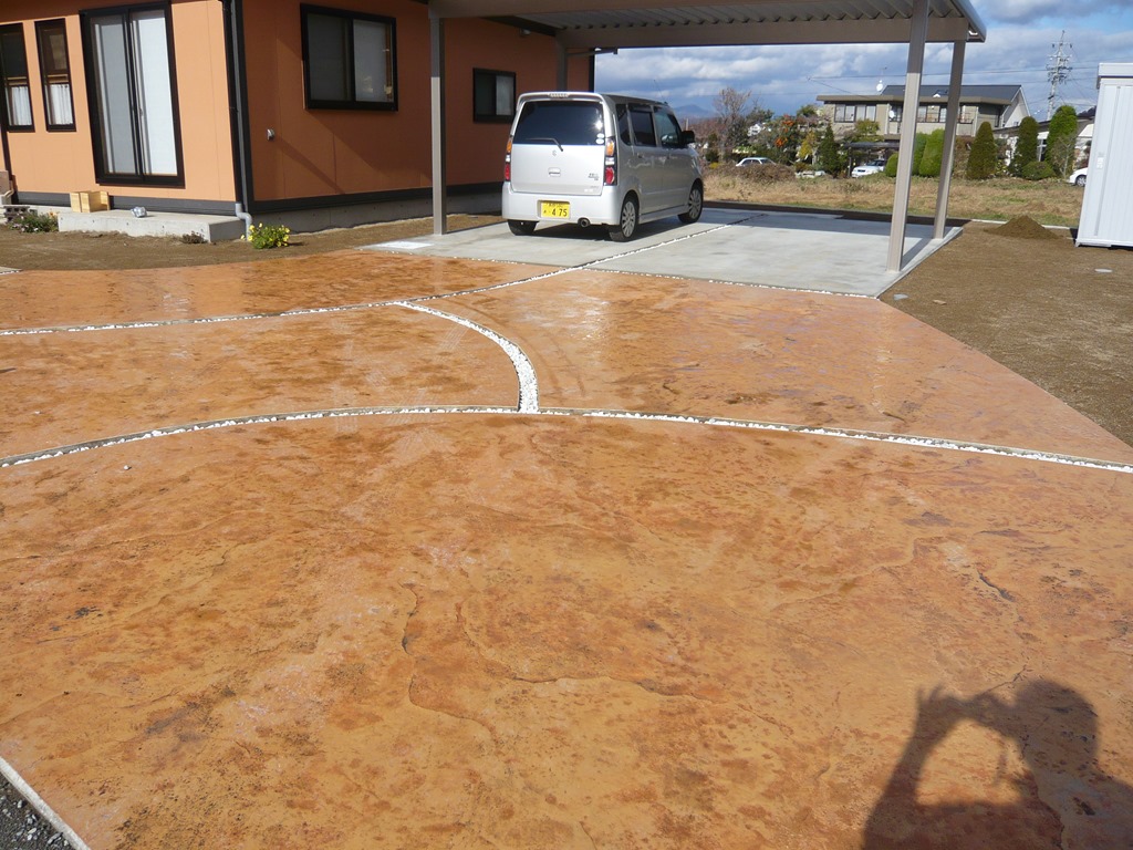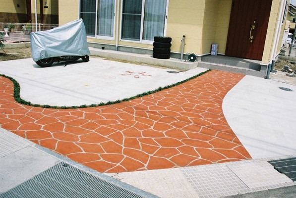 ステンシル(形紙)を使用した施工方法には、ふたつの工法があり、多くはコンクリート打設時に型紙を敷き上から色粉を撒きコテで押さえて仕上げる方法と、もうひとつは、今ある既存のコンクリートの土間にスプレーガンで吹き付ける方法です、前工法の場合は、型紙を剥がした場所は下地のコンクリートの色で仕上がりますが、後工法の場合は一旦既存の土間を色を付けてから型紙を敷くので目地の部分にも好きな色が付きます。