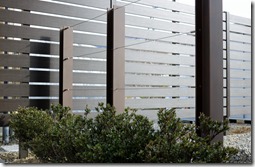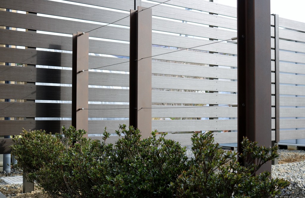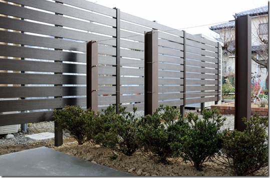道路と高低差のある庭の目隠しに化粧ブロックを積んでアルミ40角の柱を立ててアルファウッド・ディープブラウンを5段張り施工。