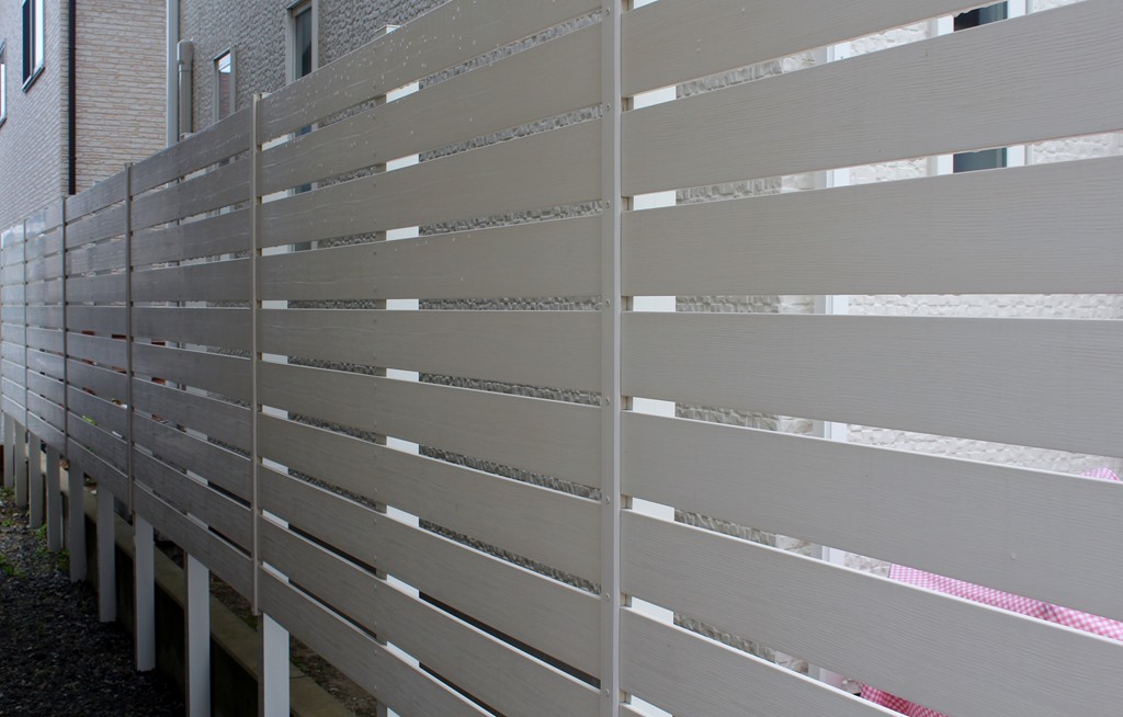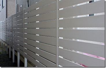 西側の隣地境界に樹脂フェンス・アルファウッドのアイボリーを内貼りにして70角のアルミ柱の高さを2㍍30㌢にして上から10段張り、東側境界の基礎上には化粧ブロツクを1段積ハイグリットフェンスを取付けました。