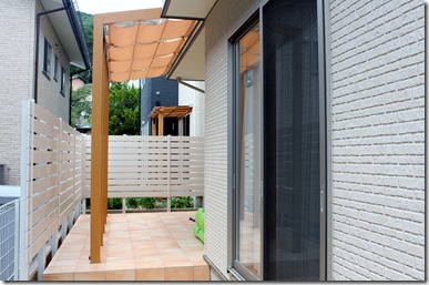 南側のリビング前には300角タイルテラスを作り、その屋根としてココマオープンテラス内部日除け付きを取付け隣地境界ギリギリまで作られたタイルテラスの前に樹脂フェンス・アルファウッドでテラスを使い易くする為に取付けました。
