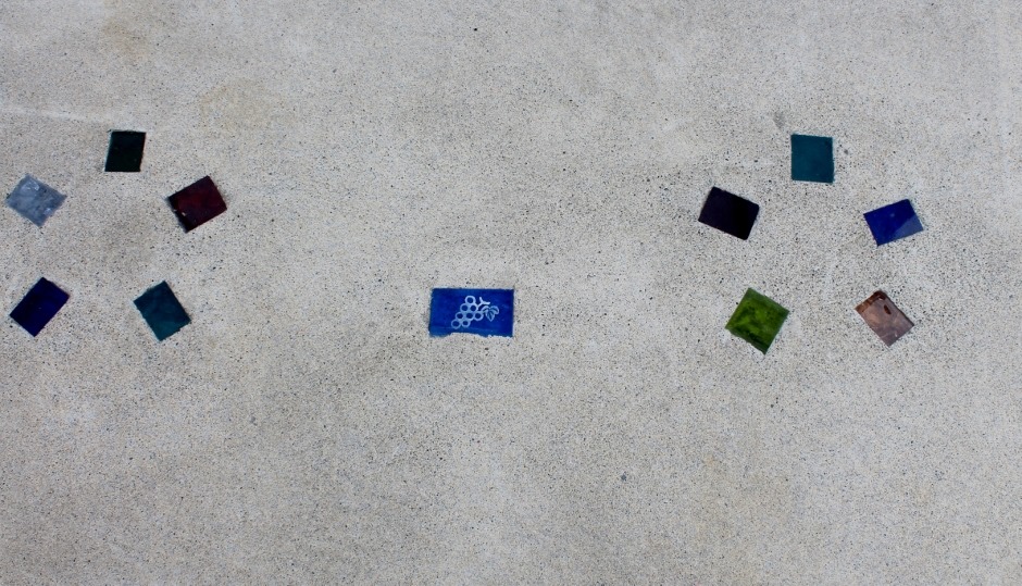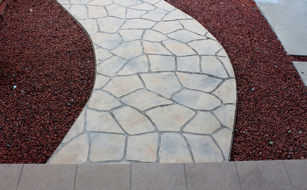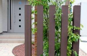玄関までの通路は、ペーパーコンクリートで仕上げ、両側に破砕瓦(テコラ)ヲ敷き込みました。門柱を作らず物置の側面、道路側に樹脂ポールを5本立て、手前に花壇、後方にシンボルツリーを植えました。