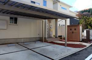 駐車場の位置が北側になるので積雪にも耐えられるソルディーポート54-50型を設置、コンクリートの床にはオリジナルのカットダルを埋め込んでいます。