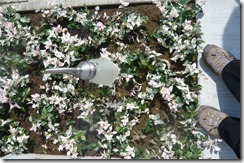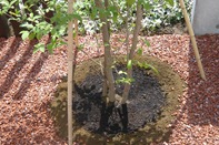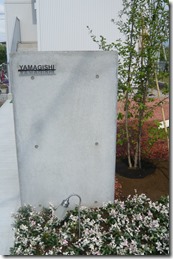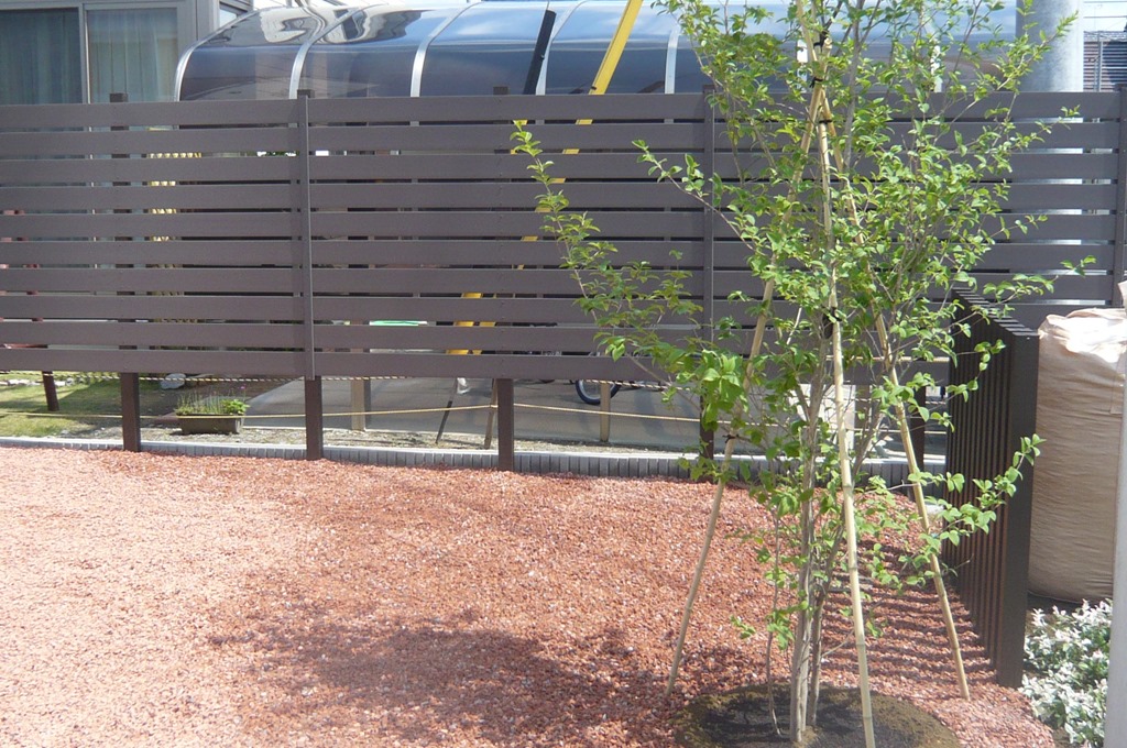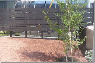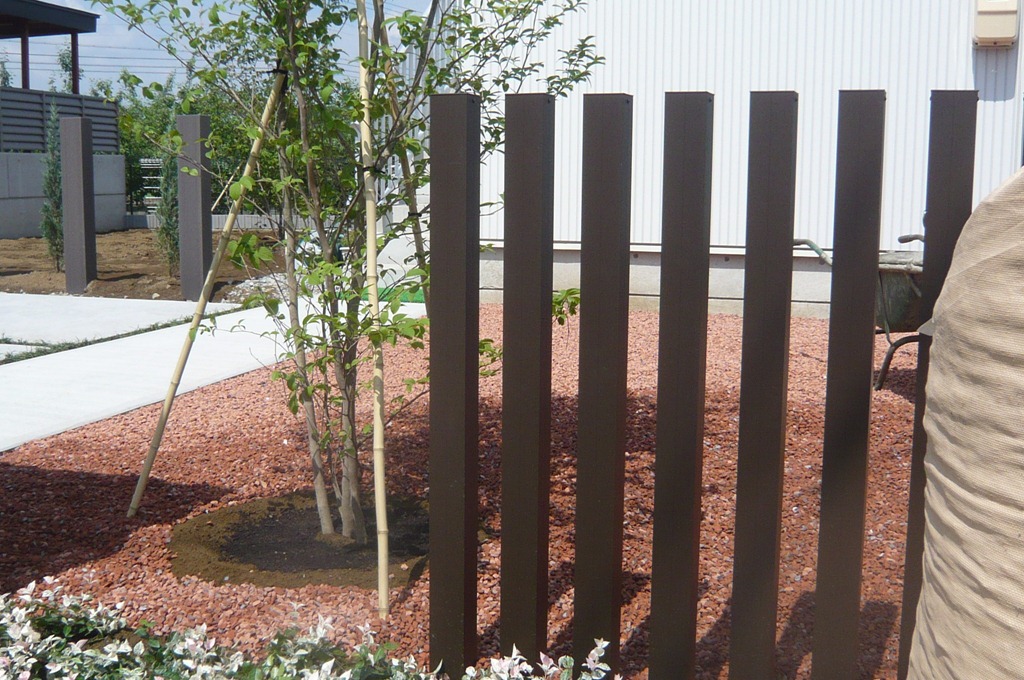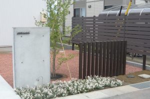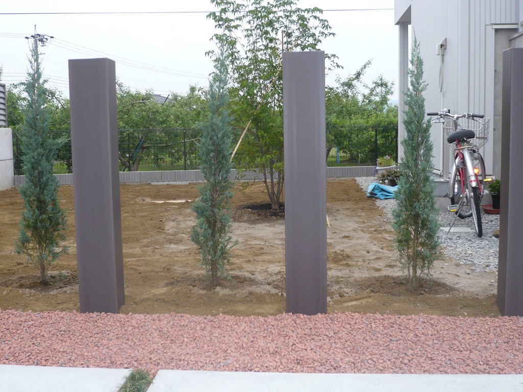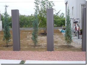 駐車場の後ろ側に、マクラギと同じサイズの特殊発砲素材のポールを立て、間にコニファーを植えました。隣地との境には、樹脂板のマイティウッドで目隠しを作りっています。
