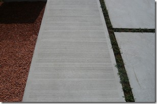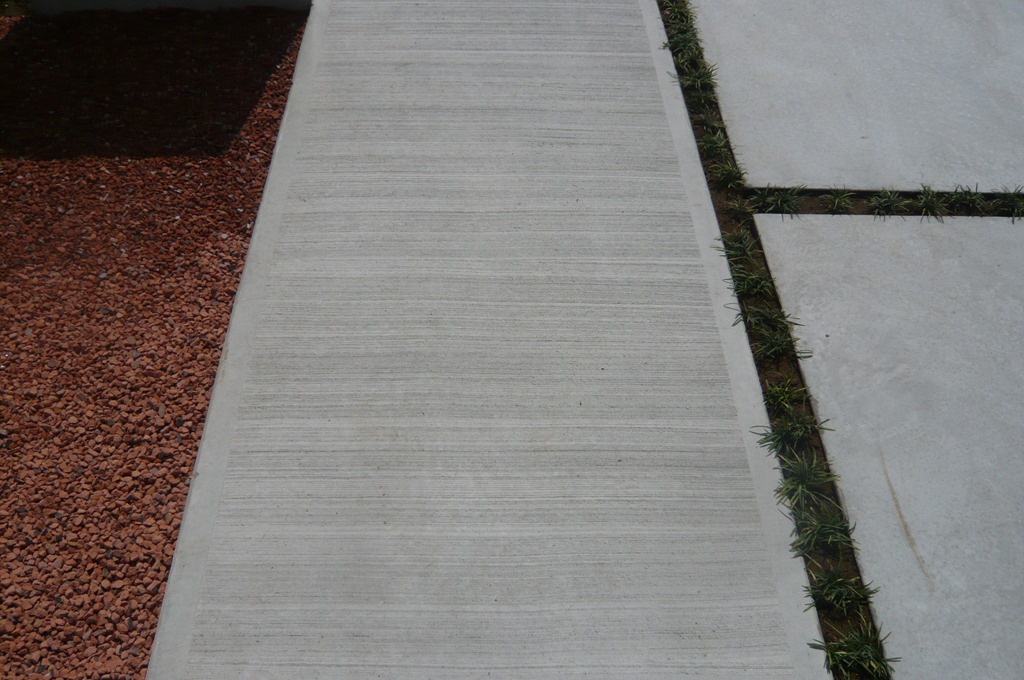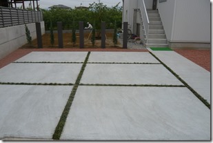 門柱だけではなく、通路も駐車場もコンクリートの打ちっ放しです。通路部分は歩きやすく滑りづらいようにハケビキで仕上げ、駐車場は金コテで何度も床面を押さえています。無機質のコンクリートの目地には常緑のタマリュウを植え、まわりにテコラ(破砕瓦)を敷きこんでいるので、コンクリートの床面がとてもきれいに見えます。