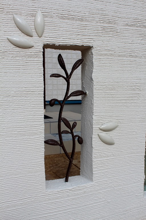 モダンシンプルの建物の玄関前に塗り壁の門柱を幅を広くして作り、センターに大きなジュエルグラスを取り付けました。サイドにティンバーを5本門柱の高さと同じに立てました。