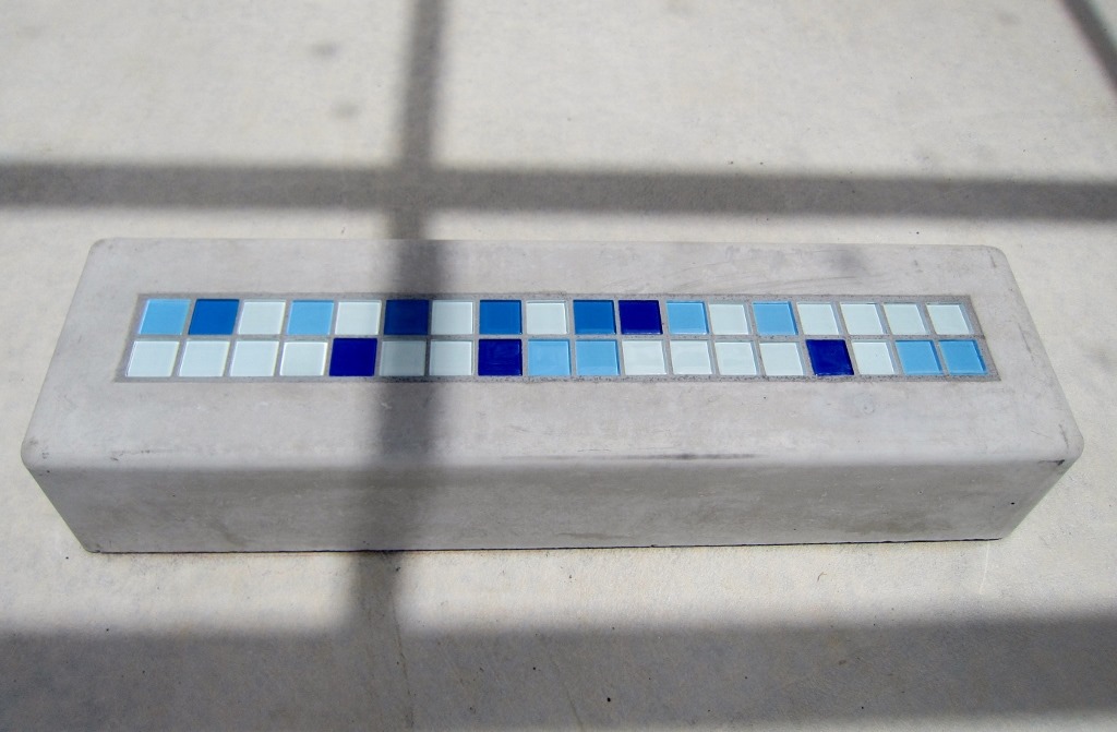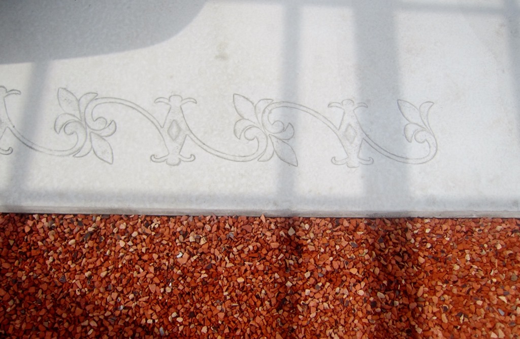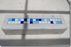 道路から入る通路は高低差があるので、レンガで縁を作りコンクリートで仕上げています。 コンクリートの中にオリジナルのカッドダルをいくつも埋め込んで、アクセントにしています。