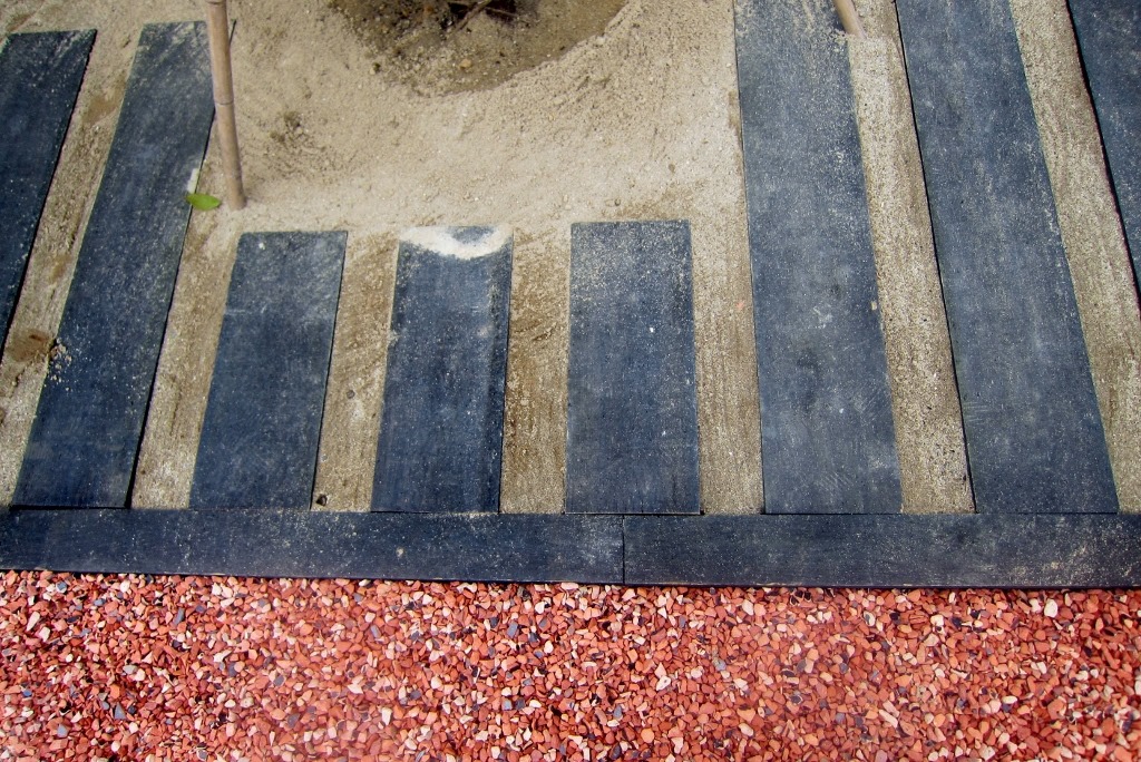 人工芝・破砕瓦(テコラ)の縁はマクラギと縁想いで施工しています。トレドで使用するマクラギは国産杉材、高耐久性防腐処理です。