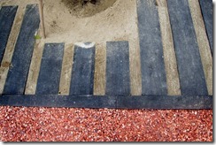 玄関までの通路もブラッドストーンで作っています。縁をマドックZで1段あげて、サイズの異なるブラッドストーン・ジロンデをパズルを組み合わせるようにして設置していきます。目地部分には細かな砂を入れています。色合いに多少の違いがあるのも魅力のうちです。