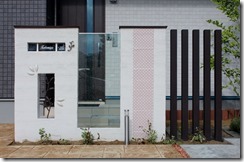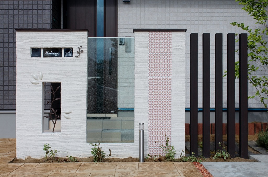 門柱はその家の顔になる部分です。広めの巾の門柱のセンターに、ジュエルグラスをはめ込み、左サイドに10cmと30cm巾で、縦ラインに1cm角のモザイクガラスを貼りました。サインはアルミ鋳物のディーズサインのショコラブラウンで、ポストがスクエアーUのセピア色、広めの門柱もガラスパネルがセンターにあることで、柔らかな印象になっています。