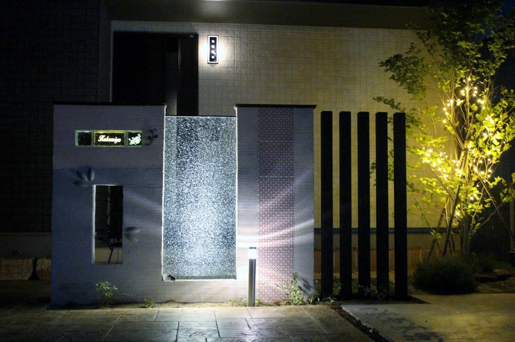 門柱に使用しているガラスは、表札のベネチアンガラスとジュエルグラスです。表札はレンガとほぼ同じ大きさのガラスに文字を彫りこみ、LEDテープを巻きつけていて暗くなると点灯して綺麗です。ジュエルグラスは裏側からLEDガーデンアップライトで照らしているので、クラックに光が反射してこちらも綺麗です。 ガラスとLED照明を使用した門柱は、シンプルですが飽きることもなく存在感のある門柱です。