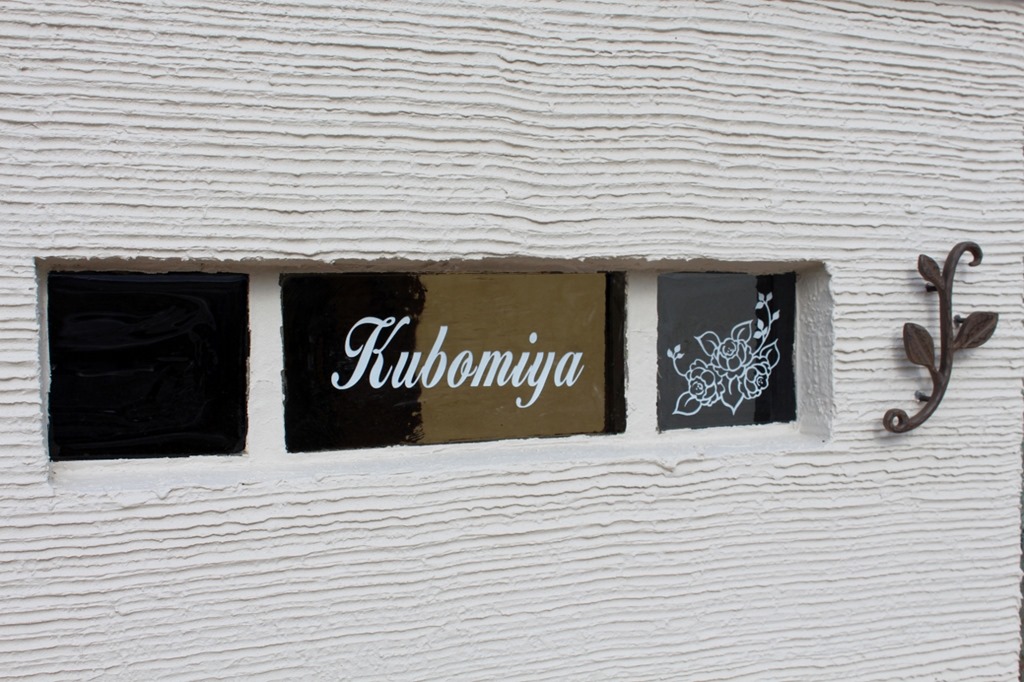 正面から見て玄関の見えづらい位置に門柱を立てることが多いです。人気のジュエルグラスを取り付け、表札はベネチアンガラスを彫って作ったオリジナルです。事務所にサンドブラストの機械があるので、自社で作っているサインです。ポストはディーズガーデンのウッドリブーFの埋め込みタイプ、笠木はFRP製のディーズデコ、アクセントにハーフティンバーの巾20mmを2本縦ラインで取り付けました。花壇はレンガを立てて作っています。