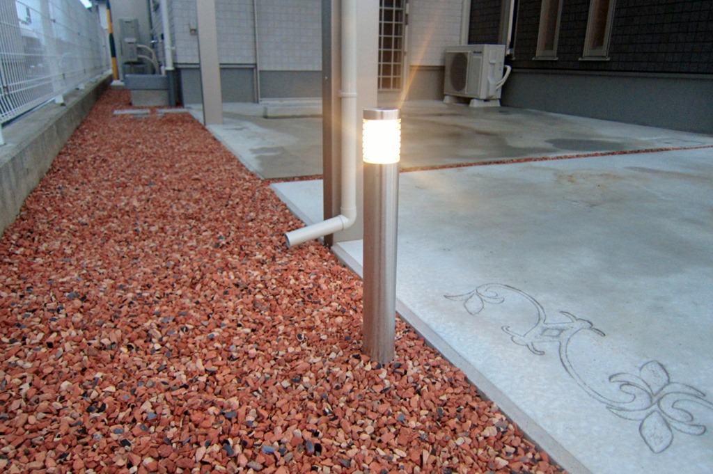 建物の両サイドと裏側は、テコラ(破砕瓦)を敷きこんでいます。その下に防草シートが敷いてあるので、雑草対策・防犯対策にもなり、見た目も砕石よりずっと綺麗です。