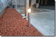 駐車場の床はスタンプコンクリートのシームレスで仕上げ、建物との間に防草シートを敷き、その上からテコラを敷き詰めています。門柱の後ろ側にブラツドストーンのマクラギ風ログ・スリーパーを飛び石にしています。不凍栓が気になったので手前にレンガを積、蛇口を変えて、水受けはレンガで作りました。