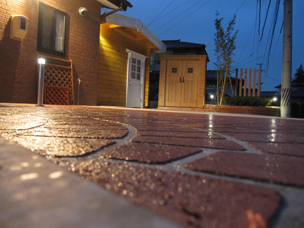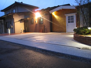 玄関前の階段を下がったところから撮った写真です。LEDライトが駐車場のコンクリートの床を優しく照らしてくれています、DCトランスを使用しているので、暗くなると自動点灯してくれます