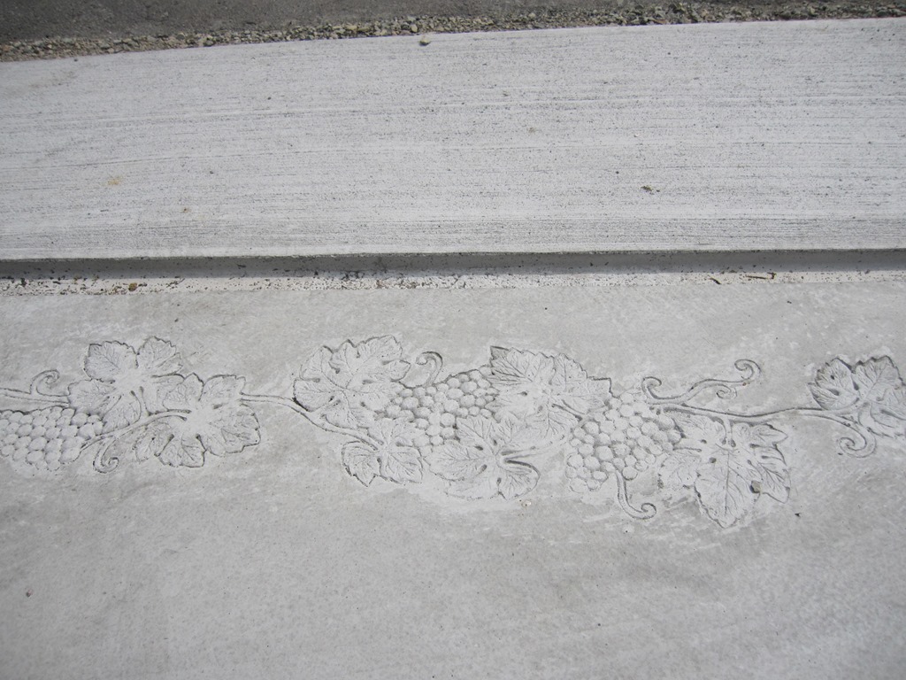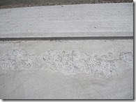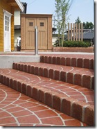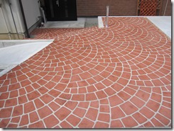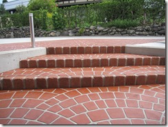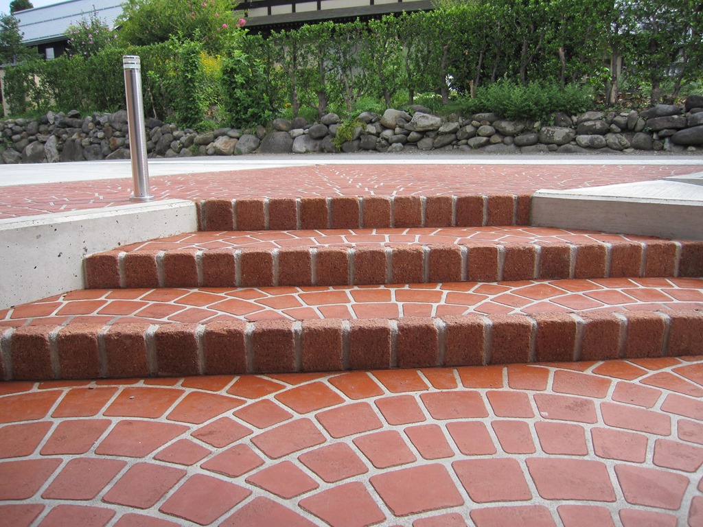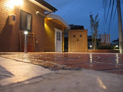 玄関に向かう通路部分のアプローチは、ステンシル(ペーパーコンクリート)です。コンクリート打設時にステンシル(形紙)模様の付いた型紙を敷き、上からハードナー(色粉)を撒いて仕上げていきます。模様は人気のヨーロピアンで、カラーは何色もあるのですが、テラコッタを使用しました。階段部分の立ち上がりは、レンガで縁取りをして仕上げています。