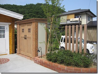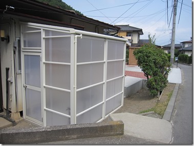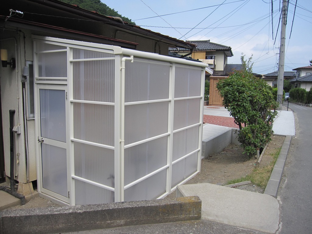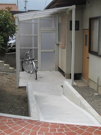 駐車場からスロープを付け、自転車置き場と物置を兼ねて、テラス囲いに入れるようにしています。外側から見えにくい素材を使い、反対側からの出入りができるよう扉も付けました。床はコンクリート打ちにしているので、使い勝手も良いはずです。