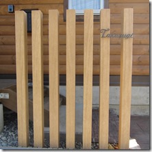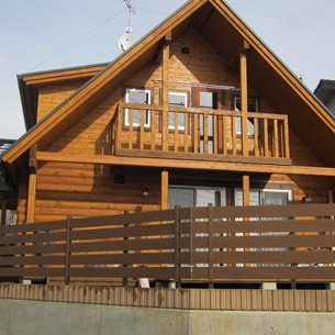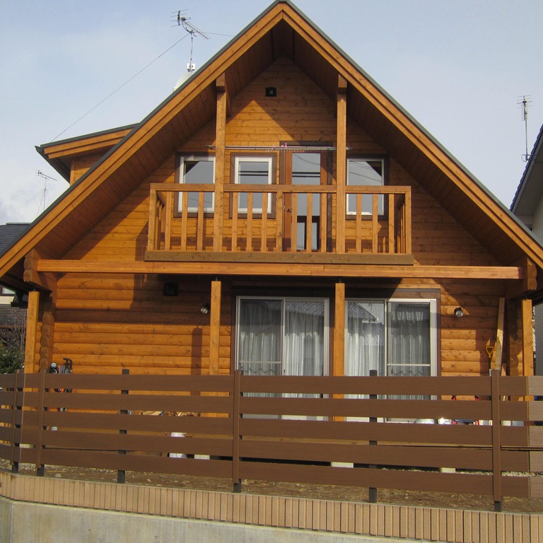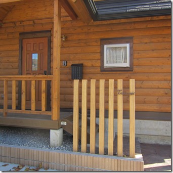 ログハウスの建物に合った外構です。ディーズガーデンのファンクションティンバーとティンバーを並べて門柱にしました。 明るいライトアッシュカラーのティンバーは繊維強化プラスチック製のFRP素材です。耐久性があり、変色もしづらいので、安心して使っていただけます。同じ色のティンバーを高さを揃えて立てたので、とても良い雰囲気に仕上がってます。