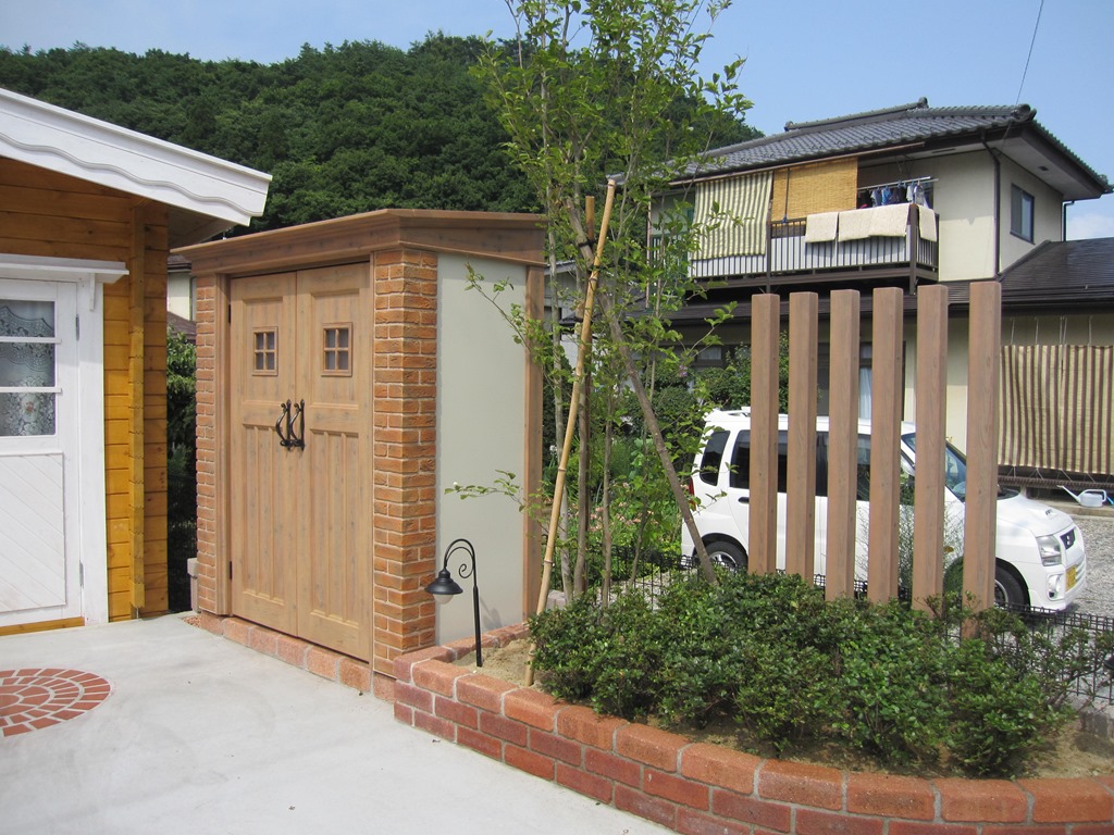 道路から下がっている敷地を上手く利用して、3台分の駐車スペースと、家の横にミニログハウスを建て、母屋と繋げました。駐車場の土間から直接ミニログの中に入れるようにして、手前横に道路から見えても見栄えのする、カンナ物置を設置し、その横にシンボルツリーを植え、花壇を設けました。何か所にも設置したLED照明の灯りで、夜も使い勝手の良い場所になりました。