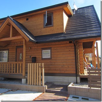 建物の横にログハウスを建て、宅地が下がっていたのですが、道路と同じ高さに駐車スペースを作りました。広めの駐車場を建物・ログハウス・花壇から夜間照明で明るく照らしています。