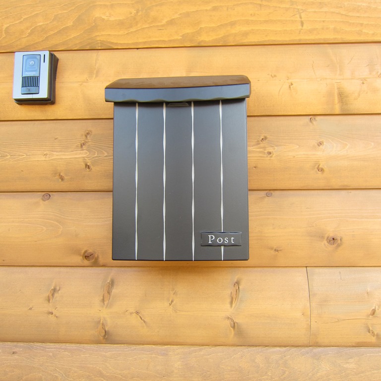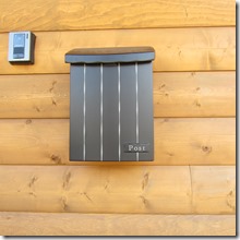 サインは、アルミ鋳物のA-07のショコラブラウンです。アルミサインは黒色の商品が多いのですが、デイーズガーデンのサインには、アールブラックとショコラブラウンの2色があります。ポストは建物の壁に直接取り付けています。アルミ合金鋳物製でモダンなデザインの「ウェーブ」のインクブラックで、重厚感がありながら使い易い、シンプルなデザインのポストです。