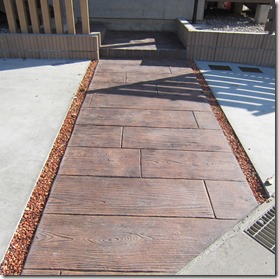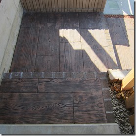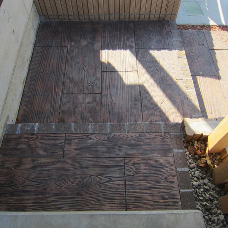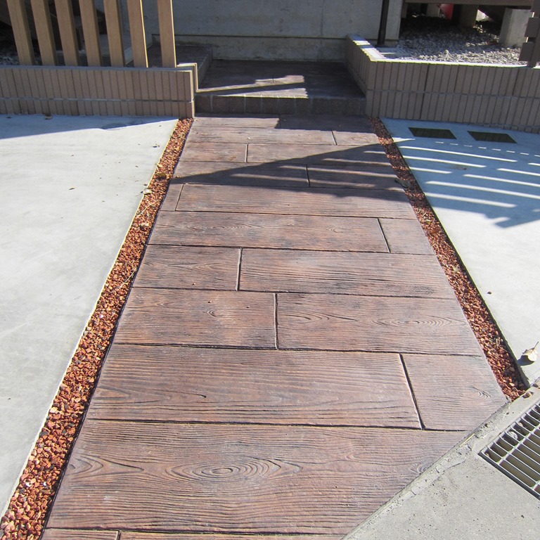 アプローチ部分の通路と階段部分を、ドリームストーンの木目で施工しました。 コンクリートを木目調に仕上げているので、車の乗りあげも可能です。階段の立ち上がり部分は、使用したレンガに近い色で施工しています。スタンプコンクリートの木目も建物に良く合っています。