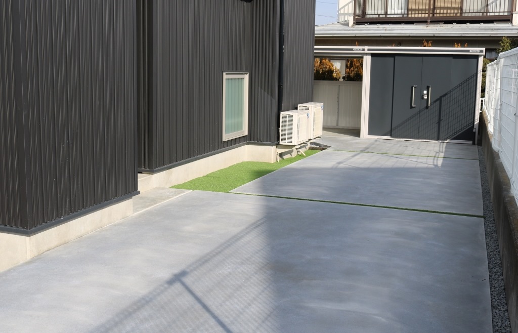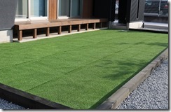 建物の南側で土の見える場所は、殆どありません。 人工芝敷きこみ庭の管理が楽にしました。
