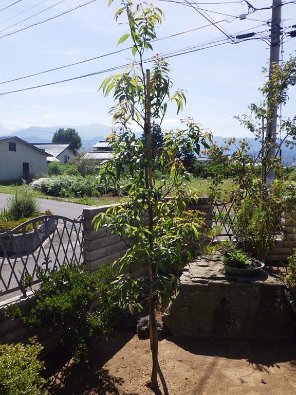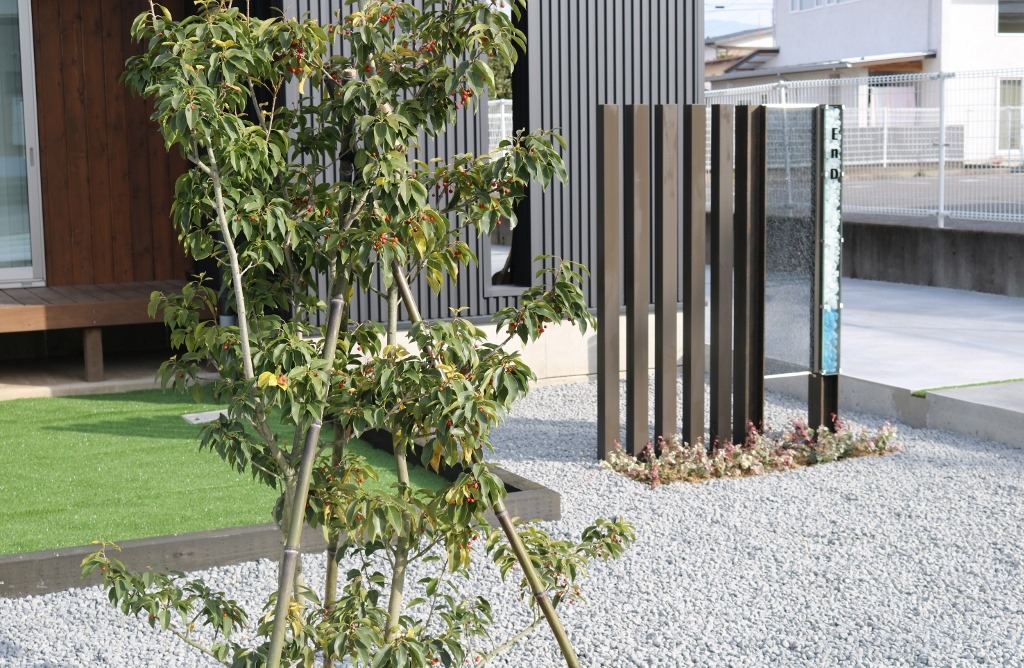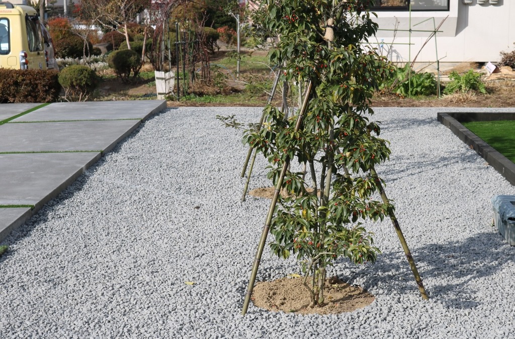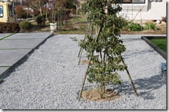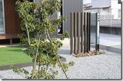 門柱の裏側にヤマボウシとシャラ・テラスの前にモミジとジュンベリー・お風呂場の前に目隠しを兼ねて常緑のソヨゴを植えました。