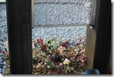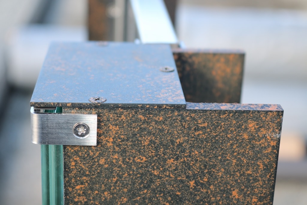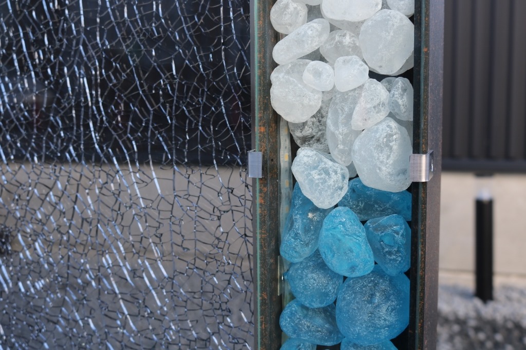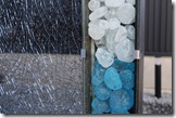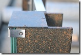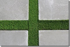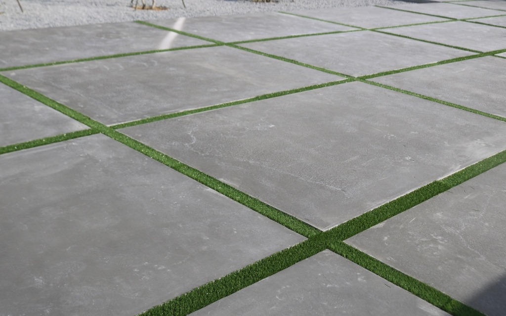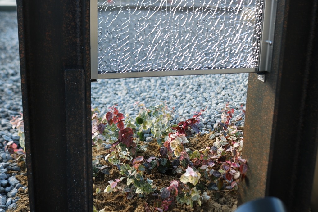 屋根があり、雨の当たらない場所の坪庭はブラッドストーンの平板と浅間の軽石で作り外側には樹脂板アルファウッドのアイボリーで目隠しを兼ねてハンキングで出来る状態を作り、御影石の水鉢の中に水の代わりにリコストーンのクリア・ブルーを盛るようにして入れました。