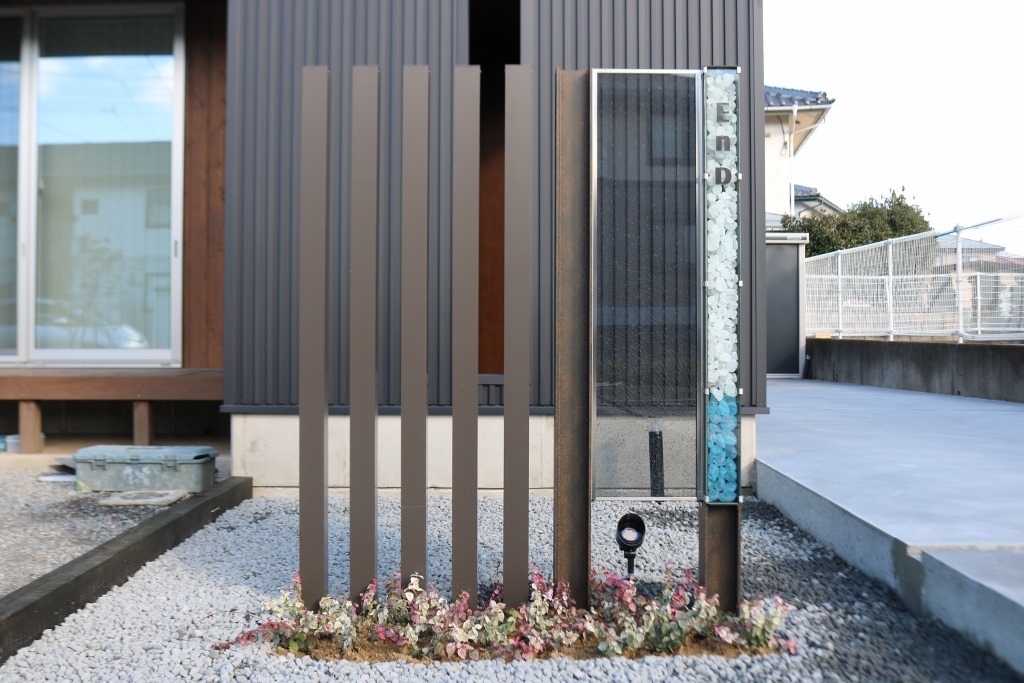 お客様と打ち合わせをして、希望を取り入れたうえで、おまかせで外構デザインをしました。 駐車場と建物の建つ敷地との高低差があるのでジョリパット塗仕上げの門柱前に天然石貼りの階段を扇状に作り、駐車場の後ろは基礎で留めをして化粧ブロックを積み樹脂板フェンスを施工して、できるだけ植栽を多く植え込みまとた。