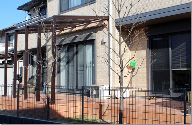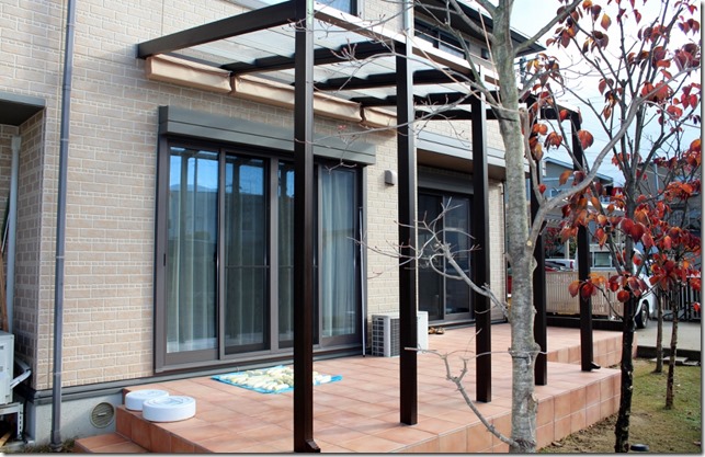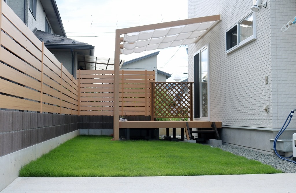 庭側のリビング前に木樹脂デッキで濡れ縁のようにして、もうひとつの折口の前にコンクリートでテラスの床を作り、床の縁にボーダーアートで形押しして模様を作り、1㌢角のセラミツクタイルを埋め込みました。 庭の緑は人工芝です。
