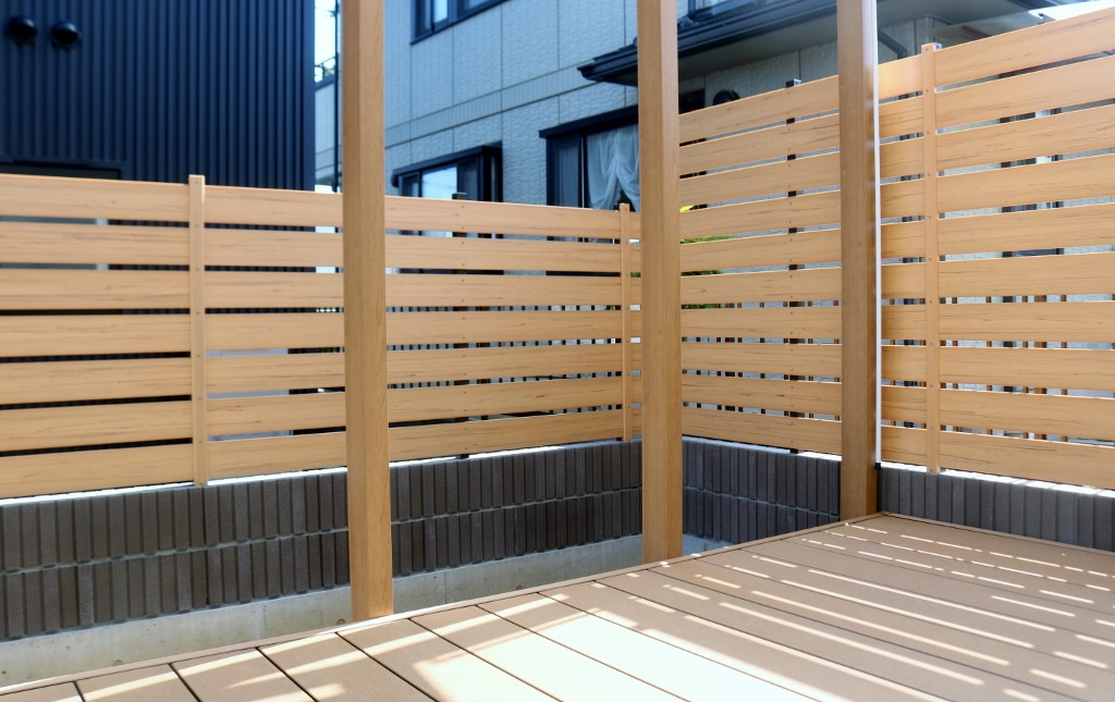 南側の境界土留めの上に化粧ブロックを2段積み樹脂板フェンスマイティウッドを8段張りにして施工しました。
