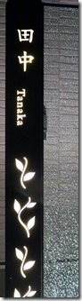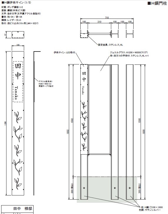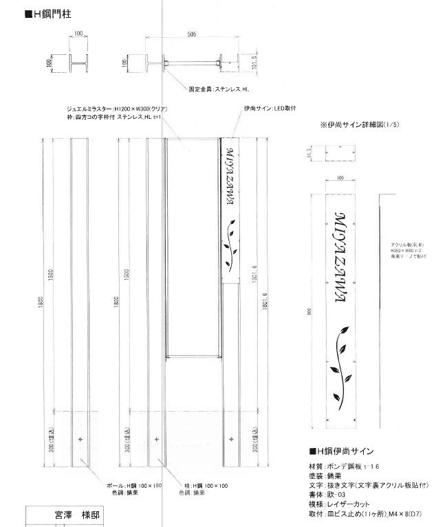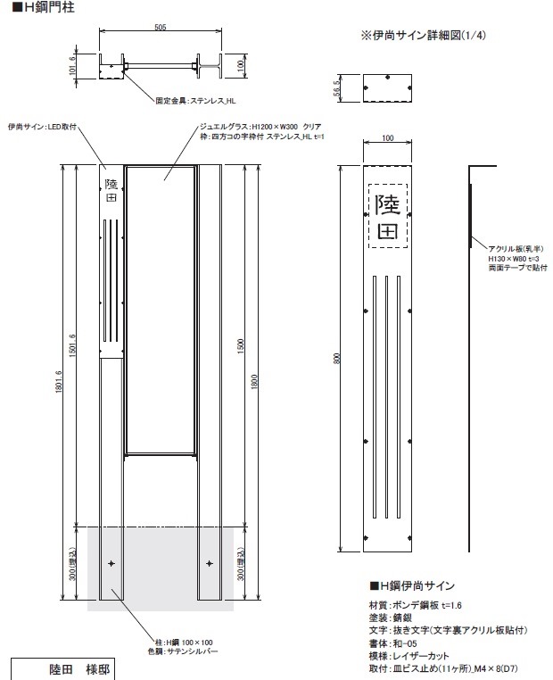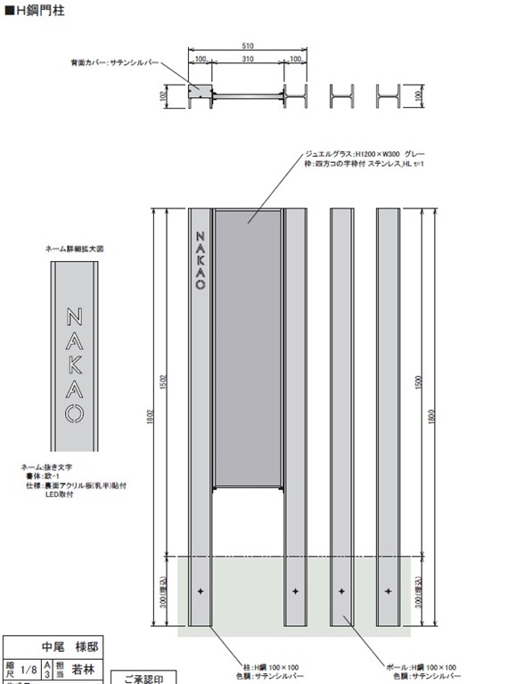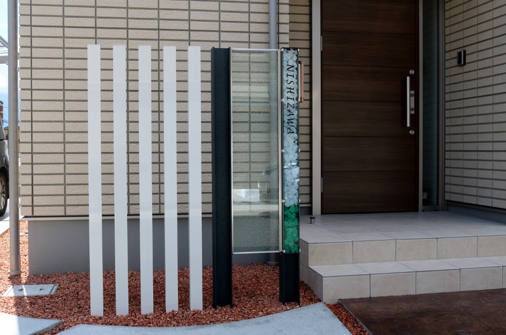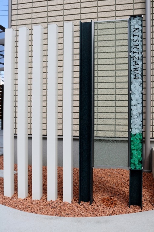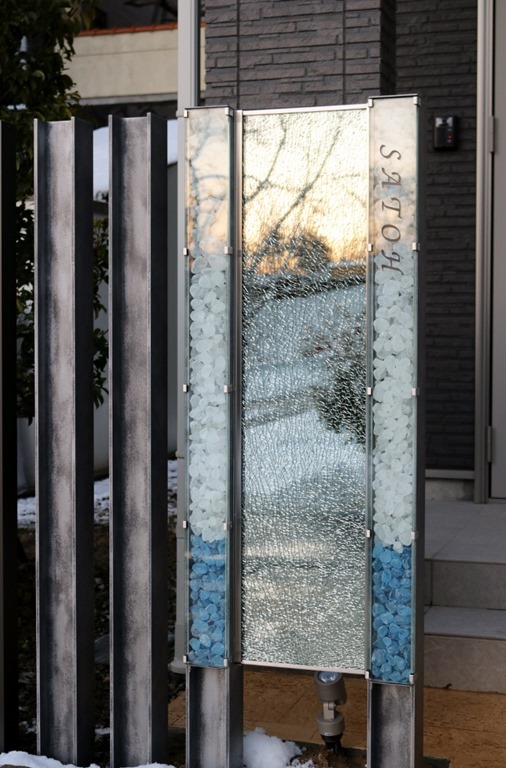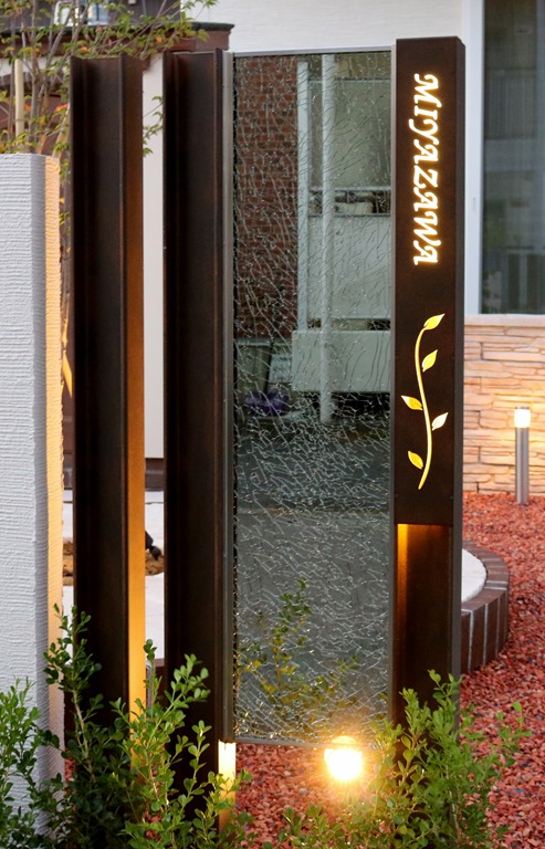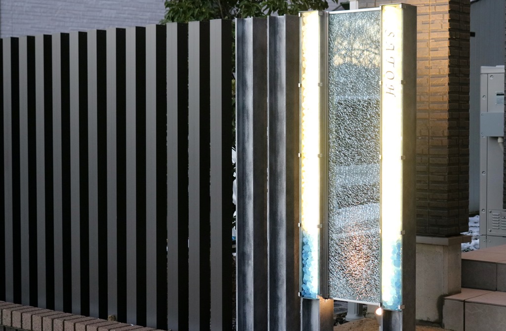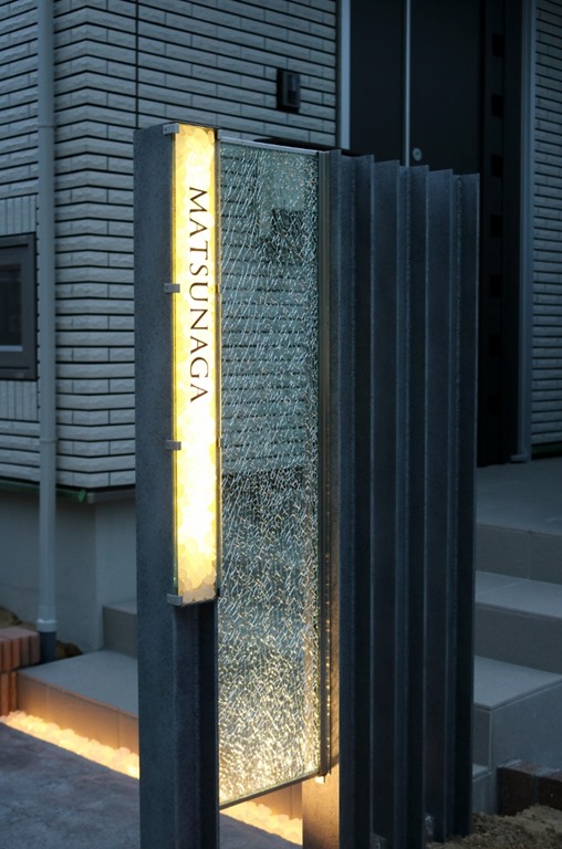 H鋼は、特殊塗装の錆銀で仕上げています。 合わせガラスの細長いサインには、欧文字で縦に名前をいれ、中にリコストーンを詰め込み、LED照明で照らしています。シンプルなストレートラインは近年の住宅にも良く似合っていて素敵な門柱になります。