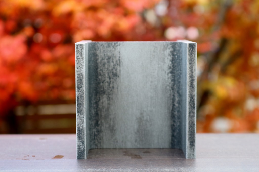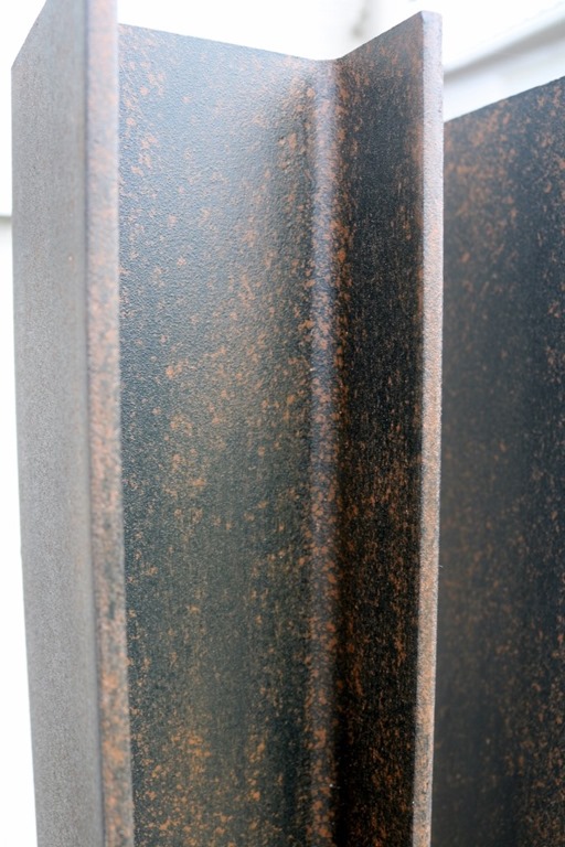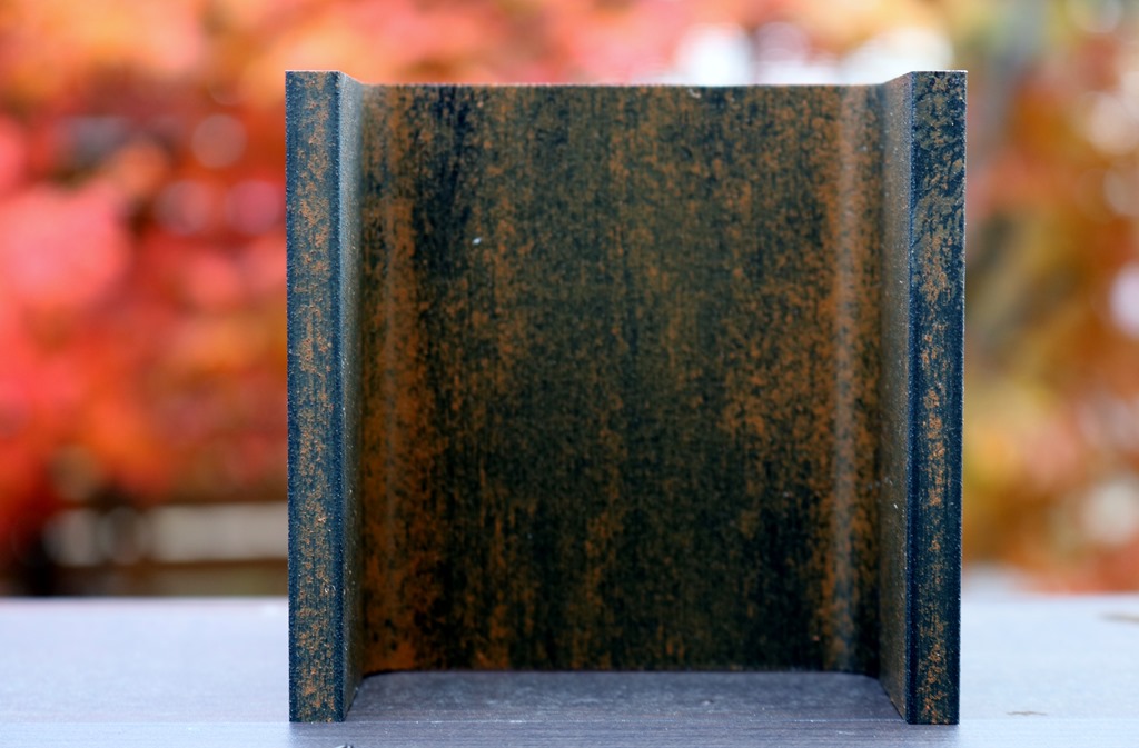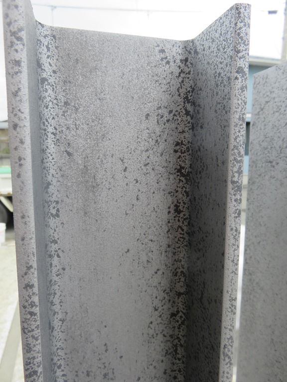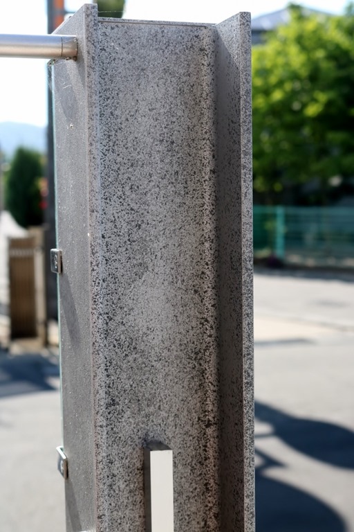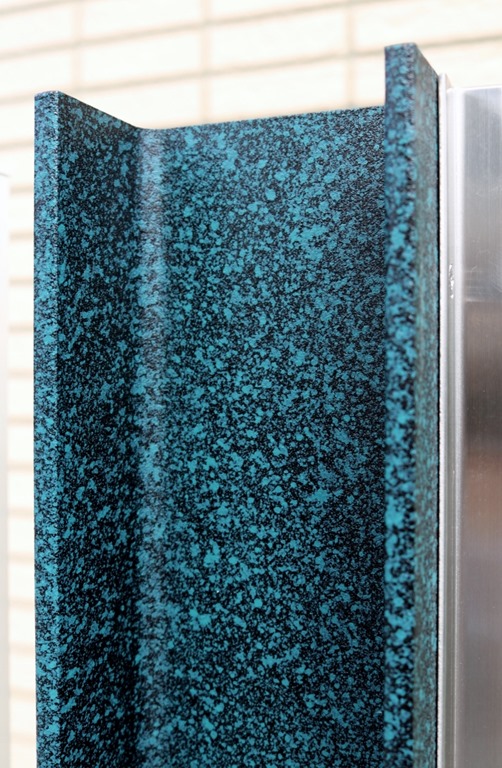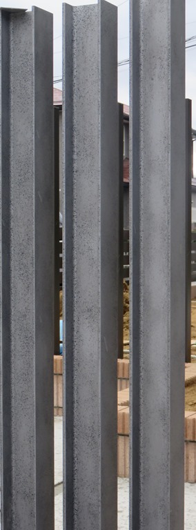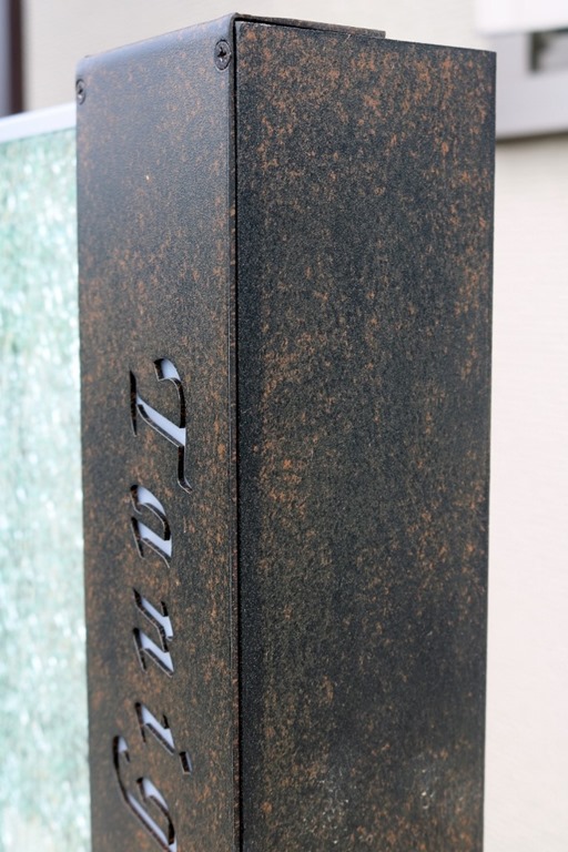 H鋼は鉄骨なので、そのままの状態だと錆びてしまいます。 いちど亜鉛メッキを施してから、もう一度塗装をするのですが、通常の色である黒・白・赤といったような塗装はもちろんできますが、特殊塗装を施して緑青のような高級感のある柱に仕上げたのが特殊塗装の柱です。 長さを1メートル80センチに加工した10センチ角のH鋼は重さが約30キロあり、30センチ埋め込んで地上から1メートル50センチに仕上げます。H鋼の柱を2本立て、その間にジュエルグラスを挟み込んでいます。