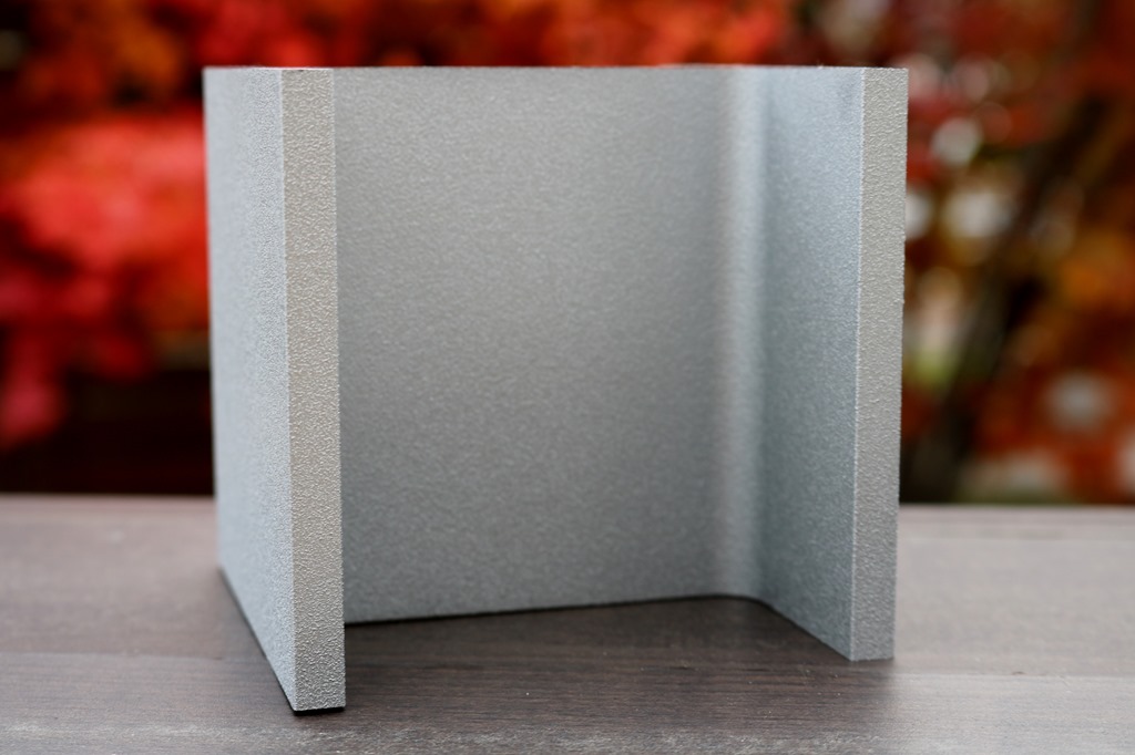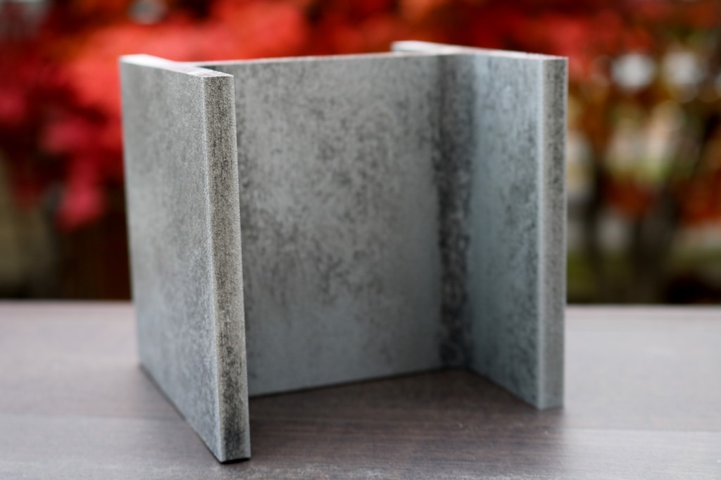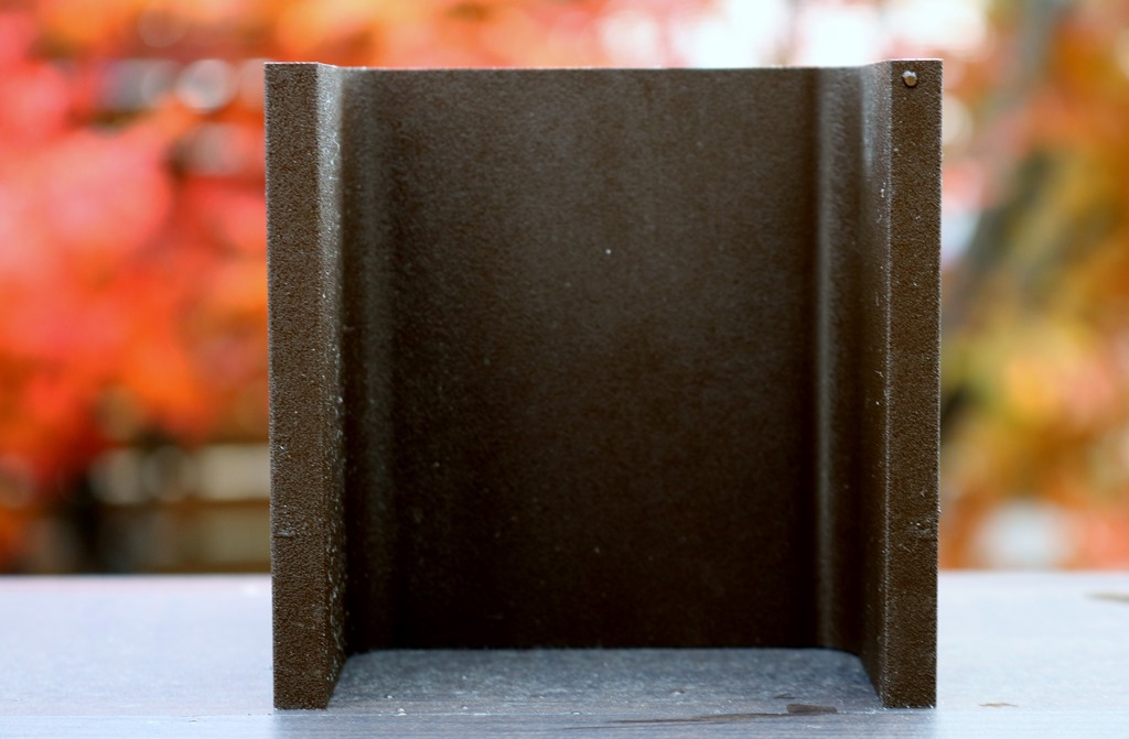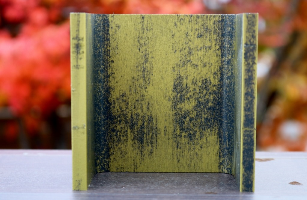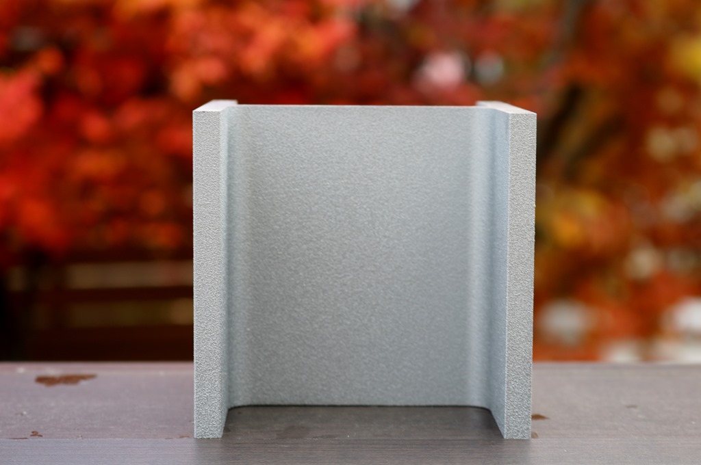 H鋼は鉄骨なので、そのままの状態だと錆びてしまいます。 いちど亜鉛メッキを施してから、もう一度塗装をするのですが、通常の色である黒・白・赤といったような塗装はもちろんできますが、特殊塗装を施して緑青のような高級感のある柱に仕上げたのが特殊塗装の柱です。 長さを1メートル80センチに加工した10センチ角のH鋼は重さが約30キロあり、30センチ埋め込んで地上から1メートル50センチに仕上げます。H鋼の柱を2本立て、その間にジュエルグラスを挟み込んでいます。