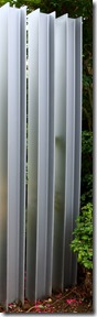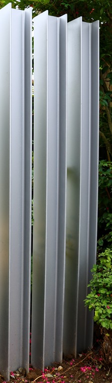 特殊塗装錆銀のアルミH鋼が4本とオータムブラウンのアルミの柱を多数取り付けテエクステリアデザインした門柱です。