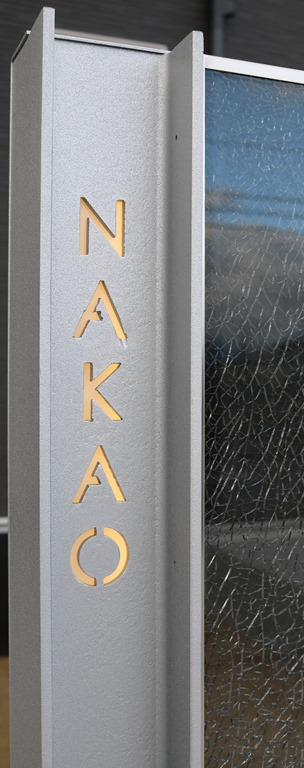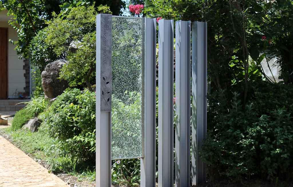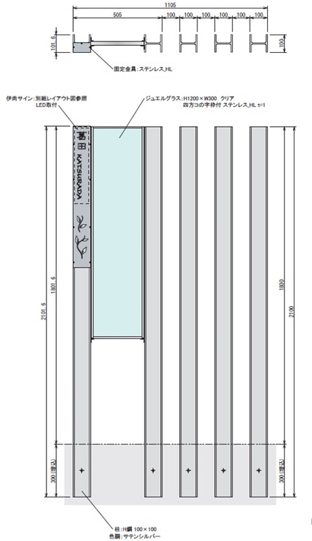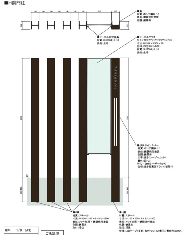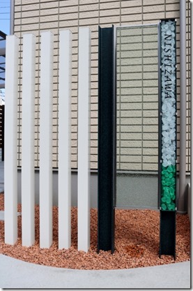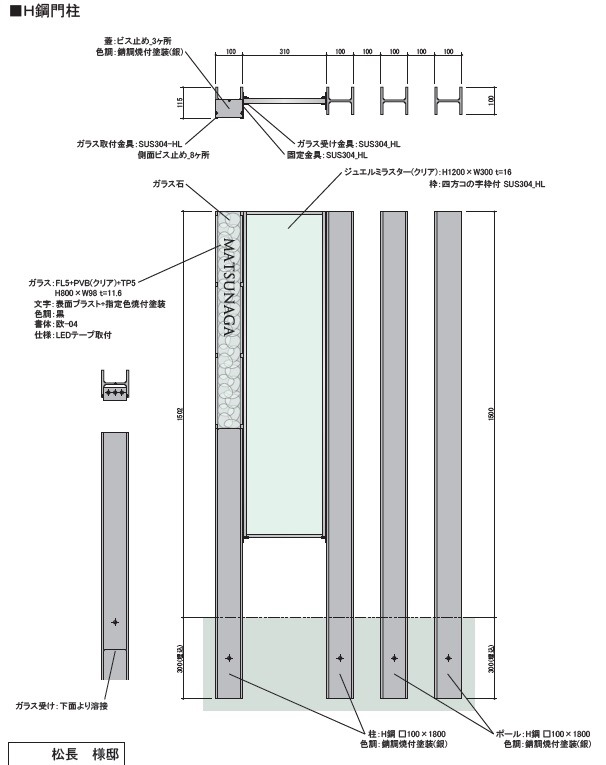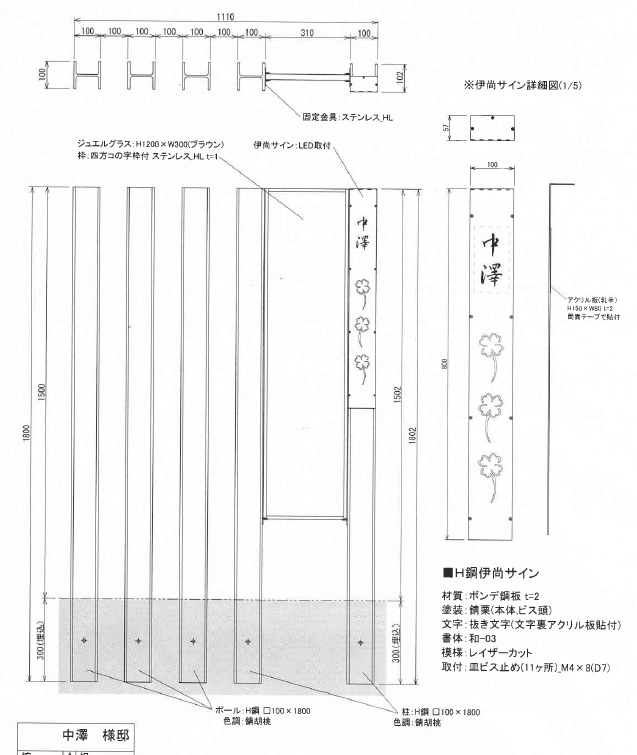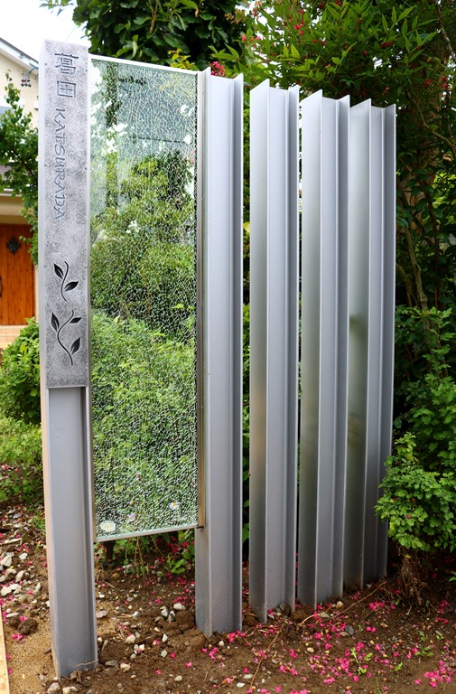 H鋼はシンプルにサテンシルバーで塗装をしてサインは伊尚の特殊塗装錆銀で作られた門柱は、ジュエルグラスを挟み込んだ2本の柱の他に3本を立ててバランスの良いデザインにして施工しました。
