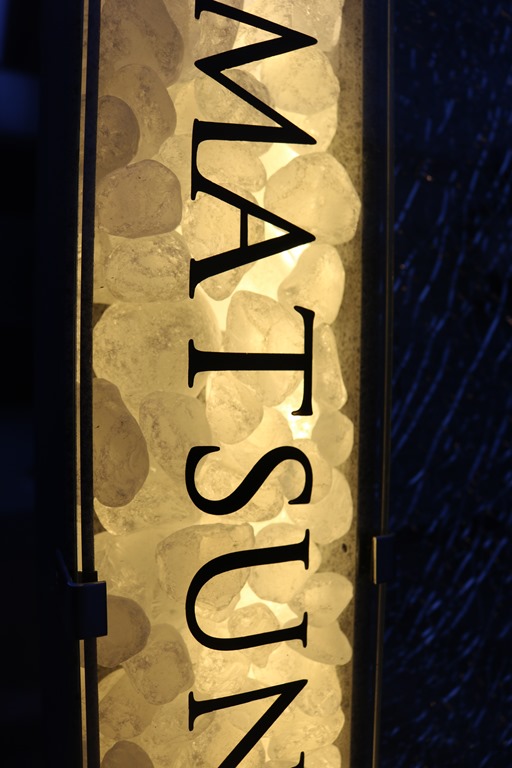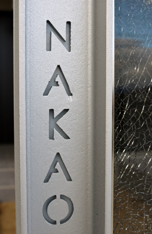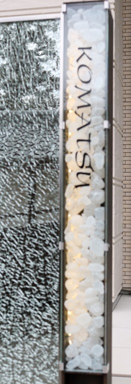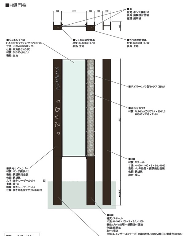 H鋼材に特殊塗装(錆胡桃)を塗装して右側の柱には、同じカラーで塗装した伊尚サインを取り付けデザインはお客様が考えたデザインで作りました。右側の柱には、合わせ硝子で蓋をしてH鋼と合わせ硝子の隙間に当社オリジナルのリコストーンを3色クリア・ブルー・ピンクを混ぜて入れました。