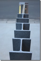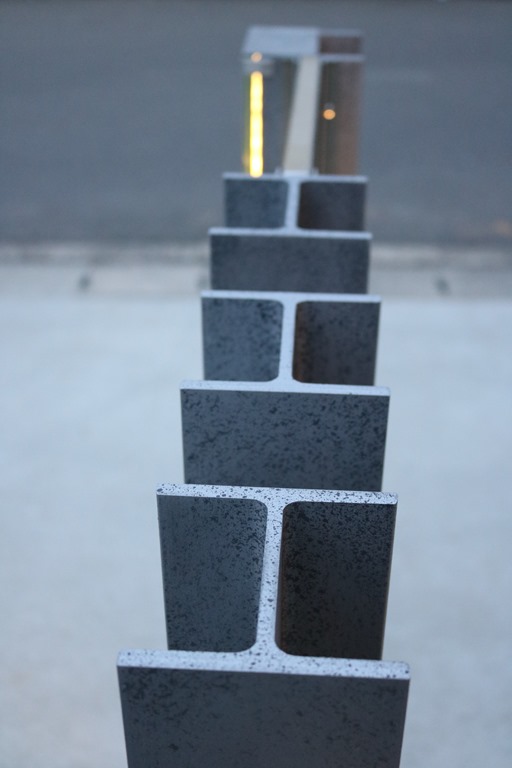 リサイクルガラス玉のリコストーンは、LEDの灯りを透過させ夜間照明にもなります。H鋼門柱を真上から見るとHの形をしている事が良くわかります。特殊塗装の錆銀に塗装された風合いは通常カラーとは異なり高級感のある味わいのある色になっています。