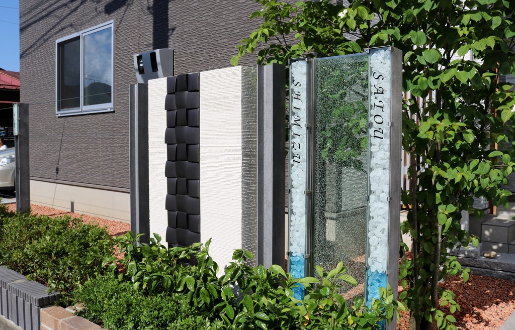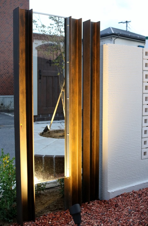 ブラッドストーンで作られた花壇の中にH鋼特殊塗装(錆黒茶)で塗装した柱を立てジュエルグラスを挟んでいます。同じカラーの柱を三本立て門柱の巾を広く見せました。伊尚のデザインもシンプルに縦ラインで作っています。