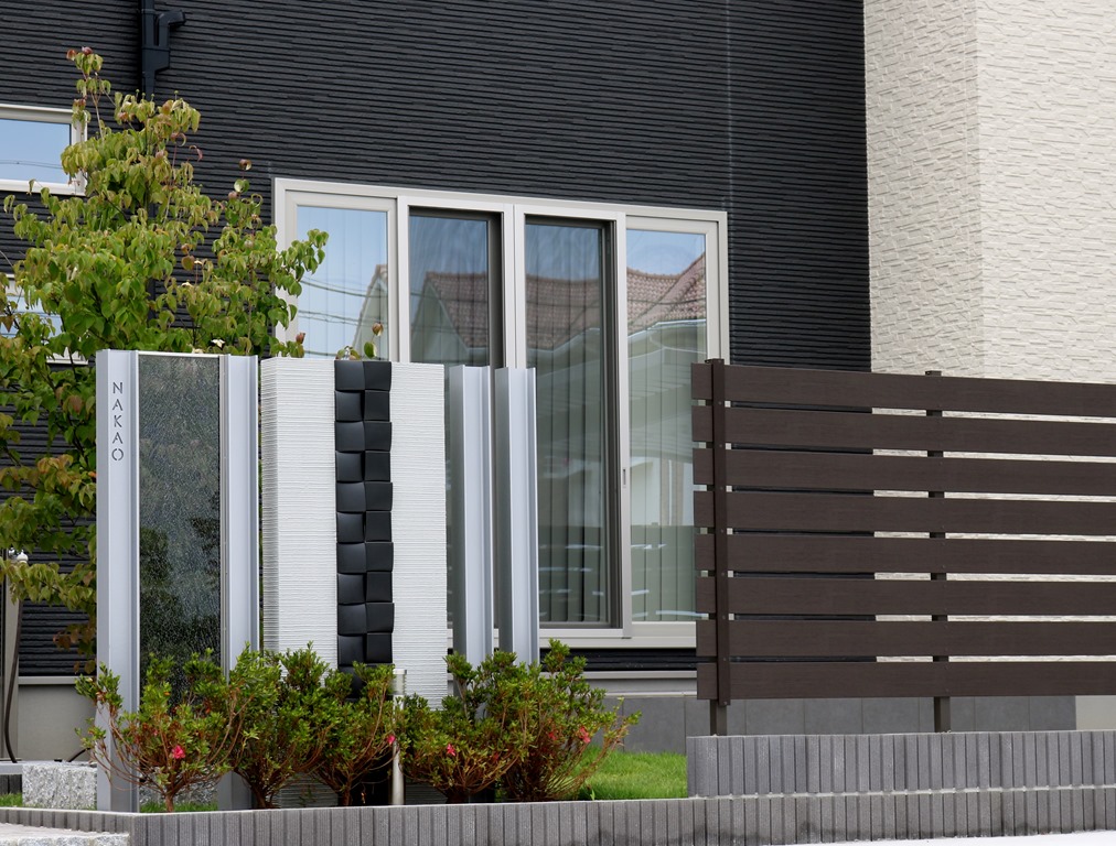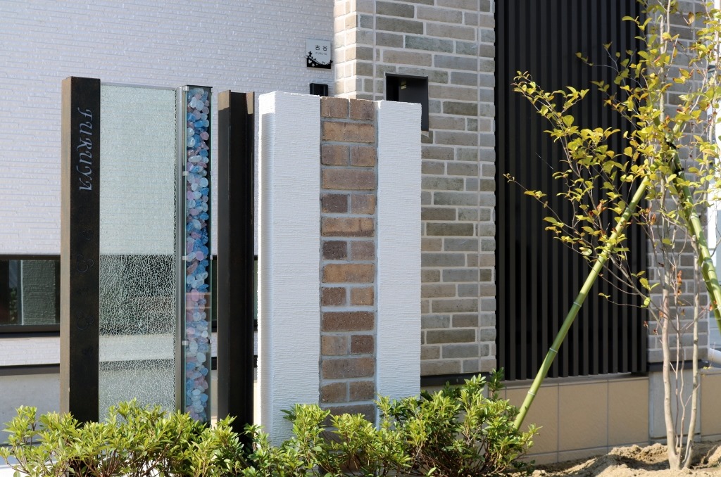 外からの視線が気にならないように樹脂板で目隠しをして、シンプルな門柱を作りました。