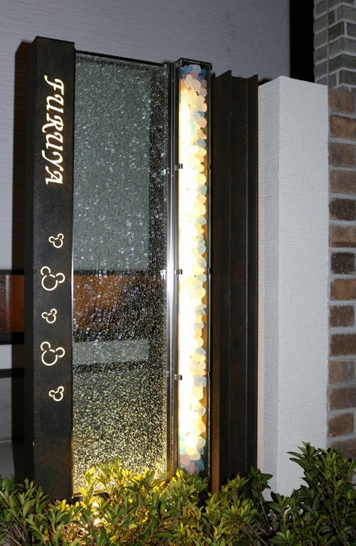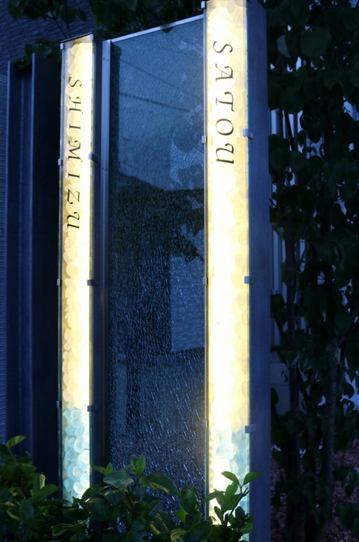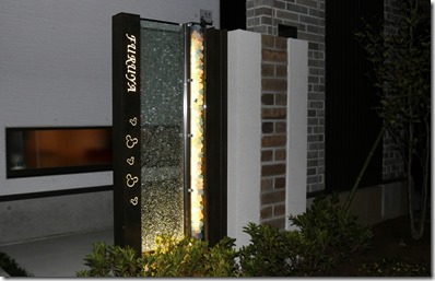 二世帯の表札を合わせ硝子に文字を彫墨付けして、中に入れたリコストーンがLEDテープの点灯と同時にリカストーンも輝きだします。門柱の横には、H鋼を柱にしてステンレスワイヤーを張りフェンスにしました。柱にも合わせ硝子を取り付けリコストーンを入れて照明にしました。