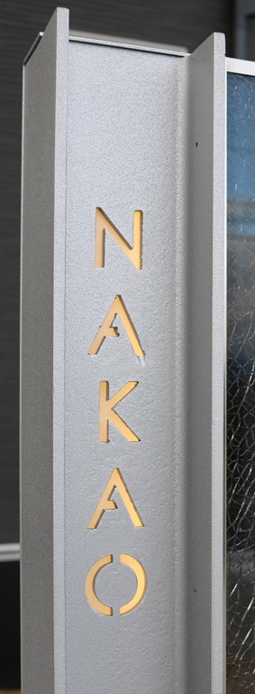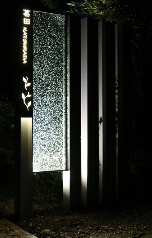 予想以上に人気のあるプレミアムH鋼門柱の柱を鉄製の物からアルミ製に変えて施工した現場です。アルミ製H鋼はサテンシルバーに塗装して、ジュエルグラスのブルーを挟み込んで施工したプレミアム門柱で、サインは鉄板をレザーカットして文字をくり抜いて作った伊尚と合わせ硝子に彫りを入れ色付けした物の2種が、当社オリジナルのサインです。 今回の現場はジュエルグラスと同じ高さ120cmの合わせ硝子を取り付け中側にガラス玉のリコストーンを入れていてH鋼にLEDテープを取り付けているので灯りが点灯すると素敵です。