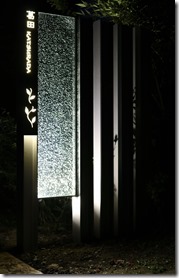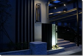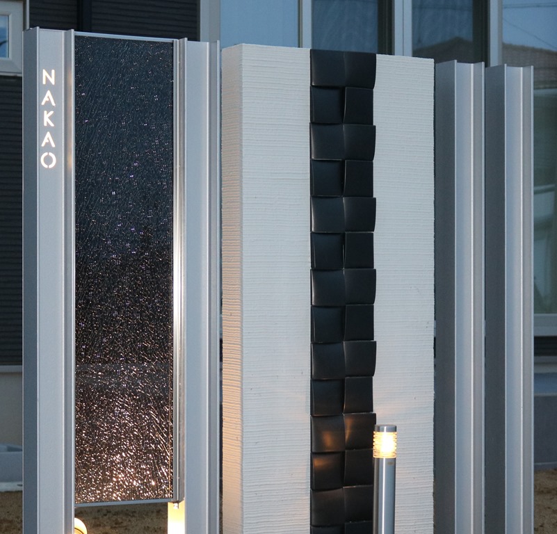 暗くもなりLED照明が点灯すると、両側の柱が明るくなります。伊尚の切り抜かれた文字から、デザインから灯りが漏れてきます。リコストーンも昼間とは違う表情にになり楽しめる門柱です。