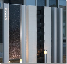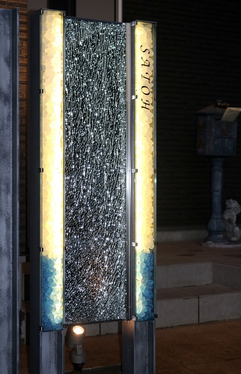 錆銀色に特殊塗装したH鋼を立て、クリアのジュエルグラスを挟みました。門柱の柱になっているH鋼に、リコストーンのクリアとブルーを入れて合わせ硝子で蓋をしました。硝子パネルの表面に文字を入れ、中に取り付けたLEDが点灯するとリコストーンが光を透過させ綺麗な灯りになります。