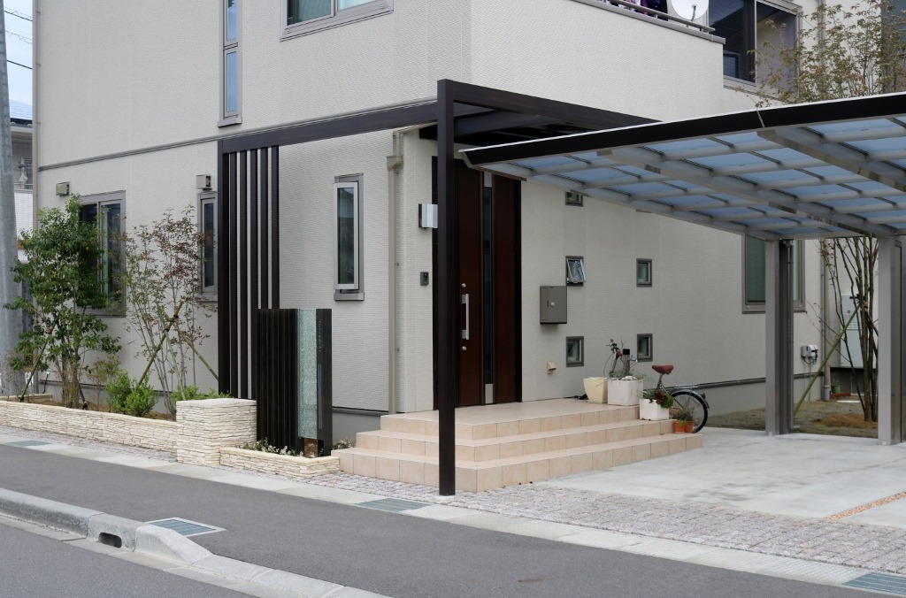 通路部分のアプローチは階段も含めてスタンプコンクリートのアシュラ模様をグレーカラーで仕上げました、階段の縁取りはレンガ、マフィンブリックのシルバーで、基礎、塗壁にはタイルを横ラインで貼りアクセントにしました。