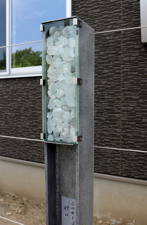 門柱の続きにH鋼の柱を門柱と同じ高さにして数本立て、ステンレスワイヤーを張り、フェンスにしました。柱の一部にリコストーンのクリアを合わせ硝子で閉じ込め、LEDを入れて照明も兼ねました。 こんな商品があればいいのにと考えて作った照明で、オンリーワンのH鋼フエンスになっています。