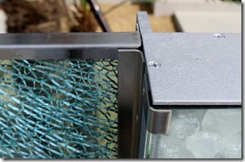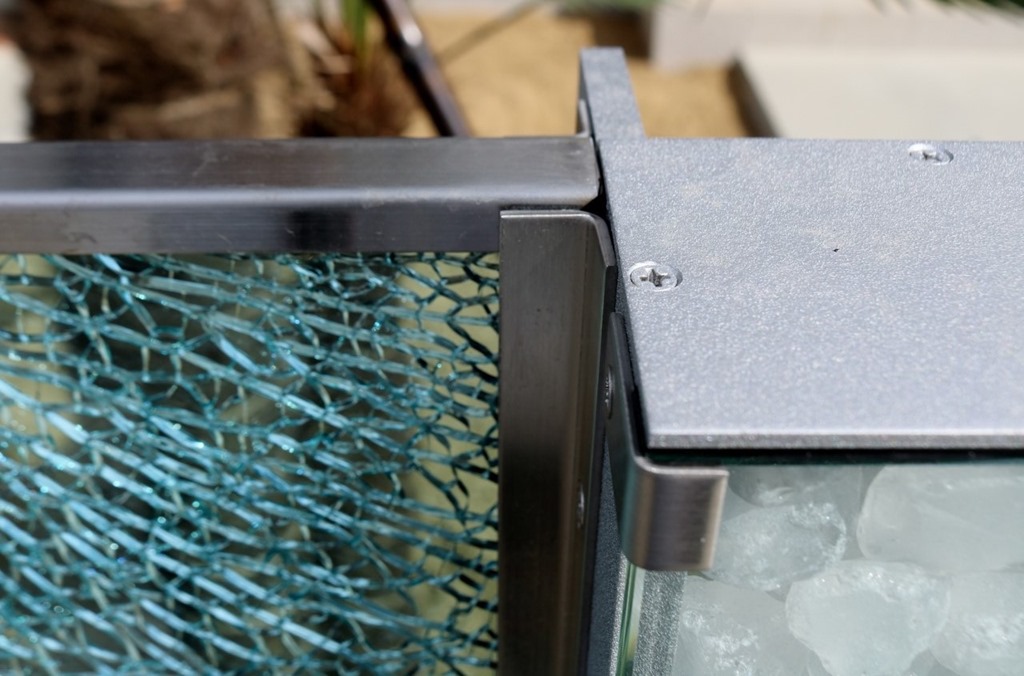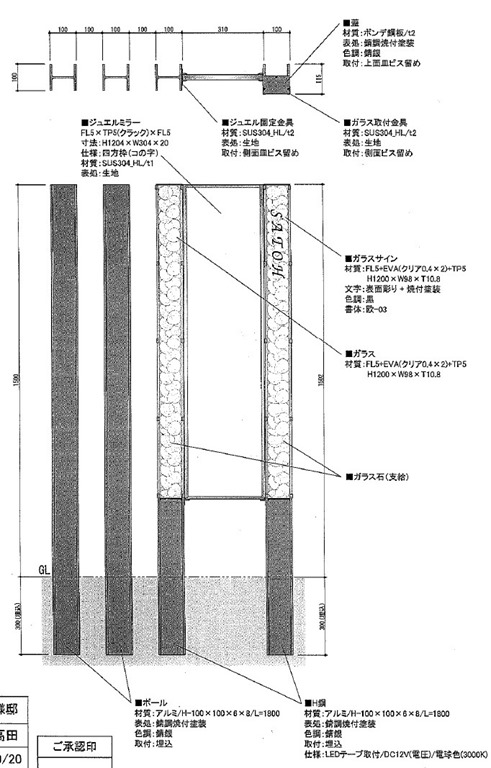 H鋼をアルミ製にして施工した最初の現場です。カラーは錆銀色で仕上げました。ジュエルグラスはミラーを使用しています。両側の柱に合わせ硝子を高さ120cmで作り取り付け、中側にリコストーンのクリアとブルーを入れ片側の合わせガラスをサインとしました。