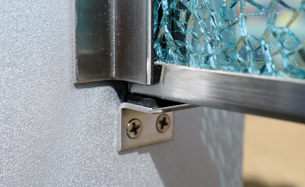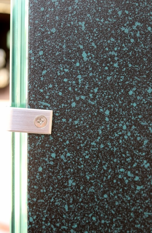 ジュエルグラスは5mmの厚みのある硝子板巾30cm高さ120cmに四方ステンレス枠を取り付けてH鋼にL型ステンレスを取り付けてをジュエルグラスの前後に取り付け固定し、ジュエルグラスの下方にステンレスで受けを固定させ取り付けています。