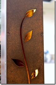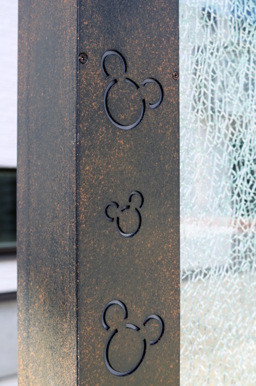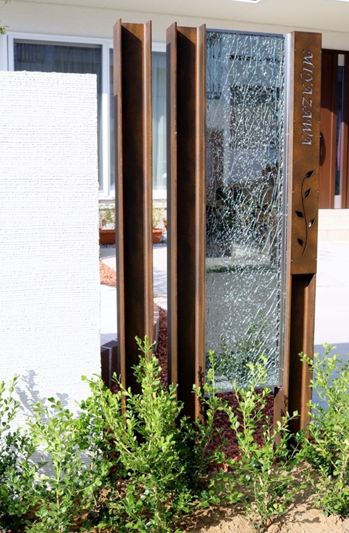 アルミH鋼の柱に特殊塗装(錆銀)で仕上げレ-ザーカットで文字・デザインを切り抜きとり文字裏にはアクリル板の乳白を取り付けているので、エクステリア照明が点灯すると綺麗です。