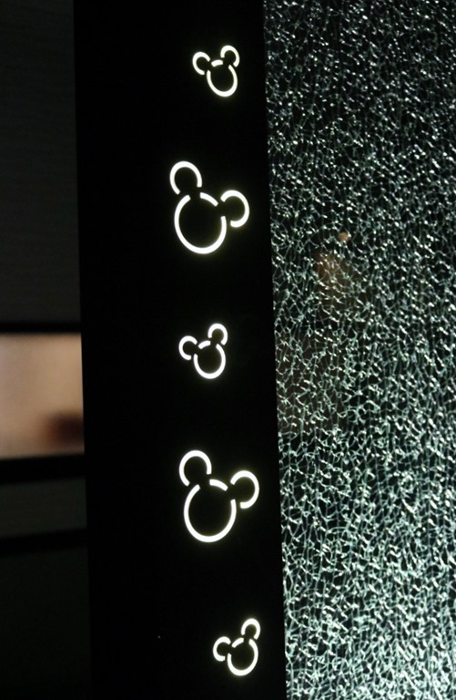 LEDテープが点灯するとサインの文字から灯りが漏れてきます。文字部分の裏側には乳白のアクリル板が貼られていて見やすくなっています。ジュエルグラスは表側と裏側からの見え方が変わるのが他のジユエルグラスとの違いです。裏側は鏡になっていて後ろの景色を写しますが近づいてみるとジュエルの向こう側も見えてくる不思議なジユエルグラスです。